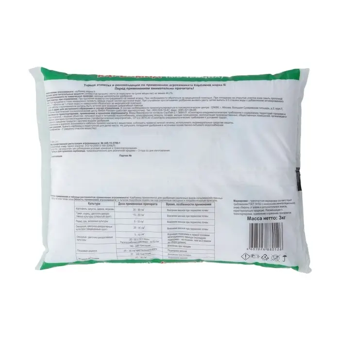 Удобрение минеральное Карбамид (мочевина), 3 кг хорошо повлияет на развитие ваших растений. Благодаря такой помощи любой кустарник, корнеплод или цветок будет сильным, здоровым, а урожай — великолепным.