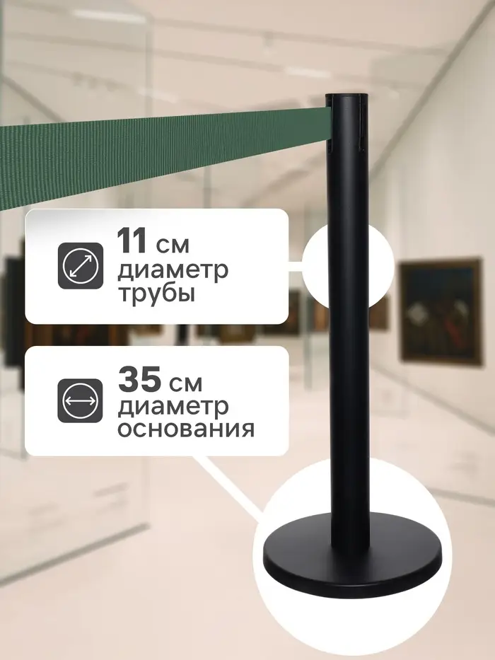 Стойка ограждения чёрная, с зелёной вытяжной лентой 470 см, высота 90 см, d=11 см, напольный d=35 см