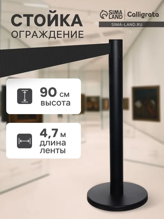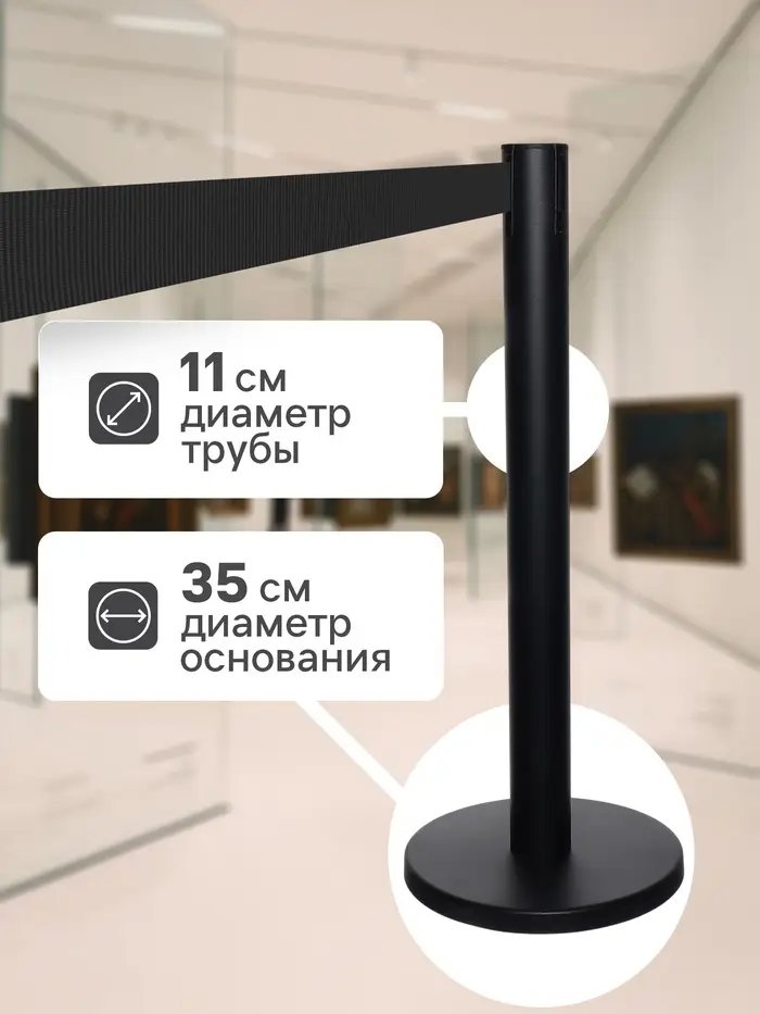 Стойка ограждения чёрная, с чёрной вытяжной лентой 470 см, высота 90 см, d=11 см, напольный d=35 см