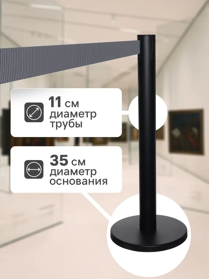 Стойка ограждения черная, с вытяжной лентой-470 см серая, высота-90 см, d=11 см, напольный d=35 см