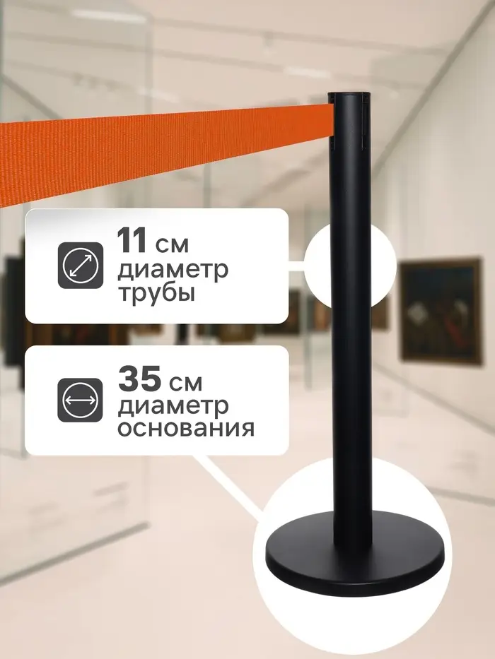 Стойка ограждения чёрная, с оранжевой вытяжной лентой 470 см, высота 90 см, d=11 см, напольный d=35 см