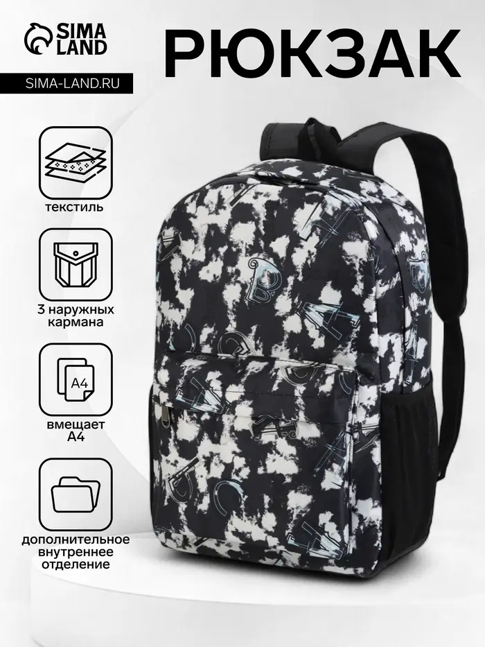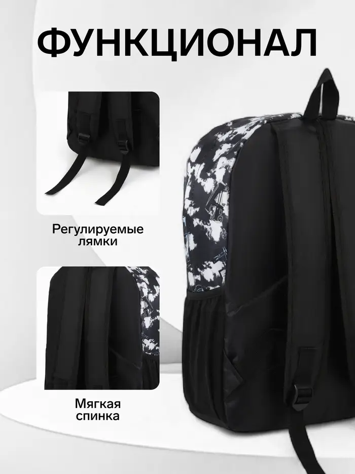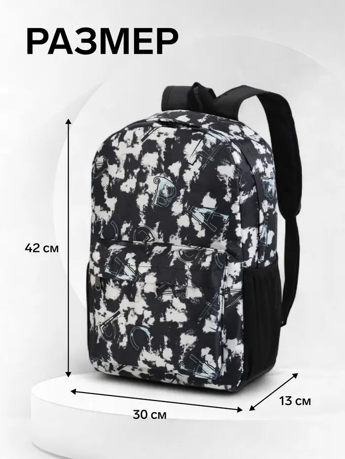 Рюкзак школьный на молнии, с карманами, с принтом, размер 30×13×42 см, чёрный/белый