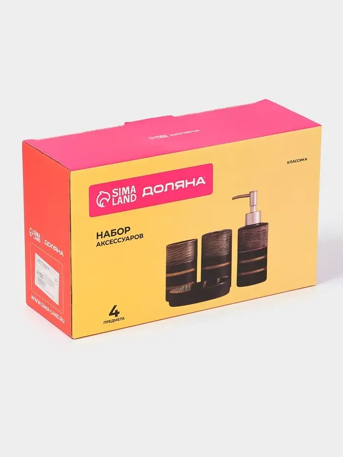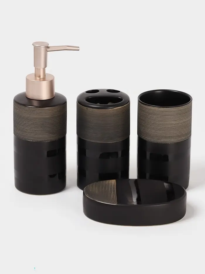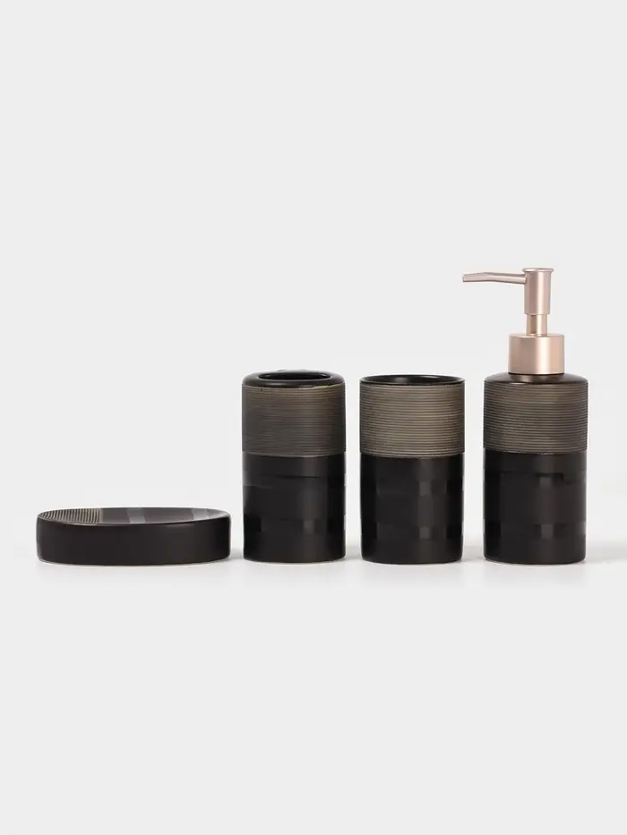 Набор аксессуаров организует пространство и станет стильным украшением Вашей ванной комнаты. За счет сдержанного дизайна данный керамический набор в ванную подойдет к любому дизайну ванной комнаты. Набор состоит из 4 предметов: 2 стакана, мыльница, дозатор.