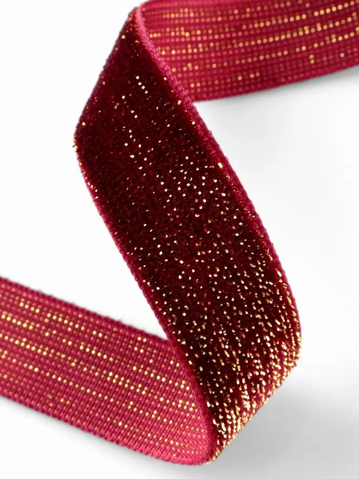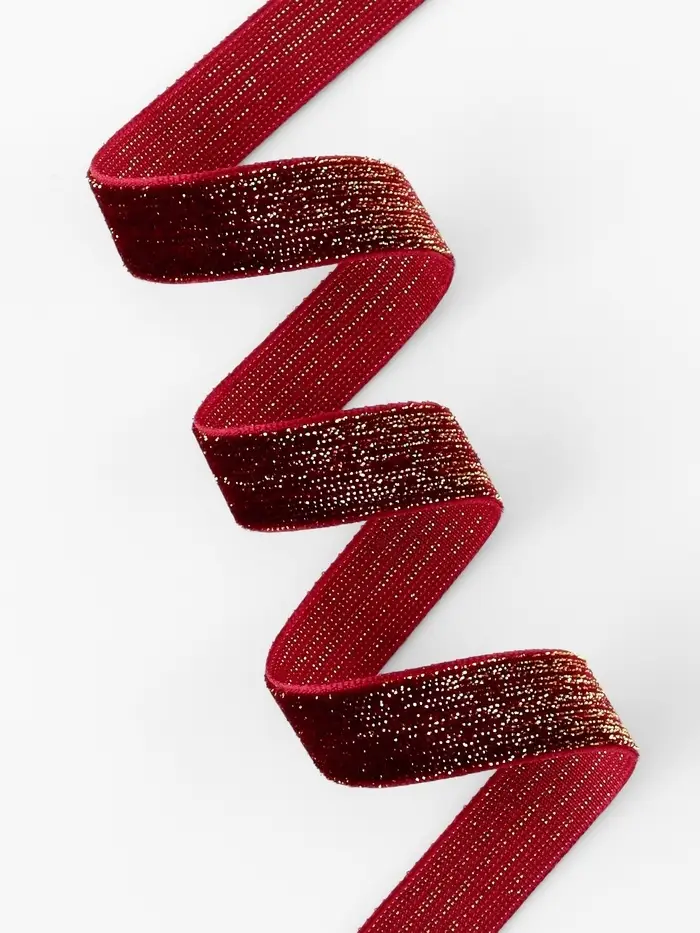 Эта бархатная лента с золотым люрексом придаёт праздничным проектам насыщенное мерцание. Сочетание глубокого бордового бархата и золотых нитей создаёт переливающуюся поверхность для выразительного декора.