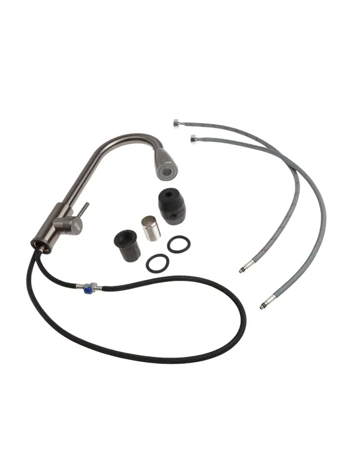 - Выдвижная лейка: Гибкий шланг убран в высокий излив длиной 205 мм. Лейку можно вытянуть и направить в нужную точку.