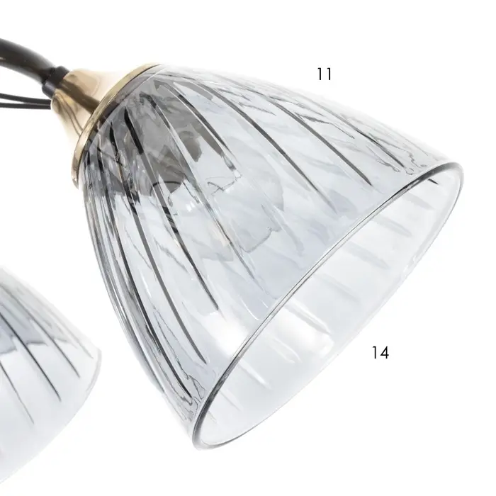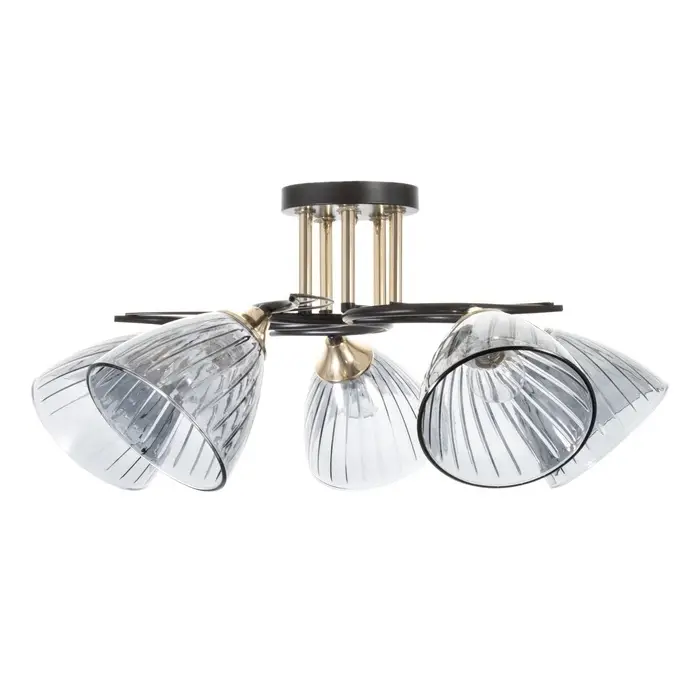 Чёткая симметрия, продуманная функциональность: Пять конусных стеклянных плафонов с тонированным покрытием мягко рассеивают свет, устраняя резкие блики и создавая комфортную атмосферу. Чёрно-золотая палитра работает как архитектурный акцент, не перегружая пространство. Это не просто источник света – это центр композиции, который объединяет интерьер. Подходит для тех, кто ищет надёжное, стильное и эффективное освещение для большой комнаты без излишеств.