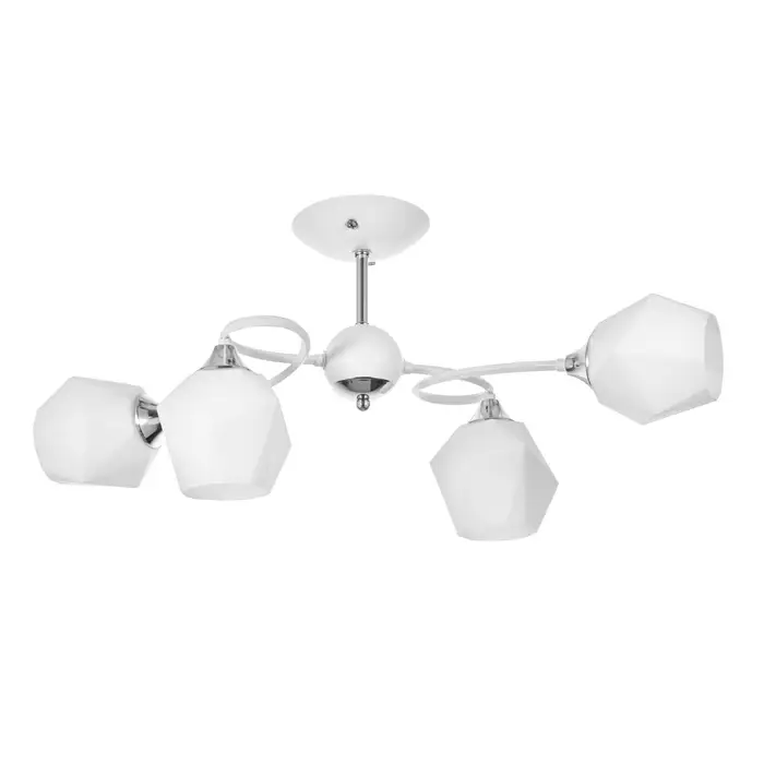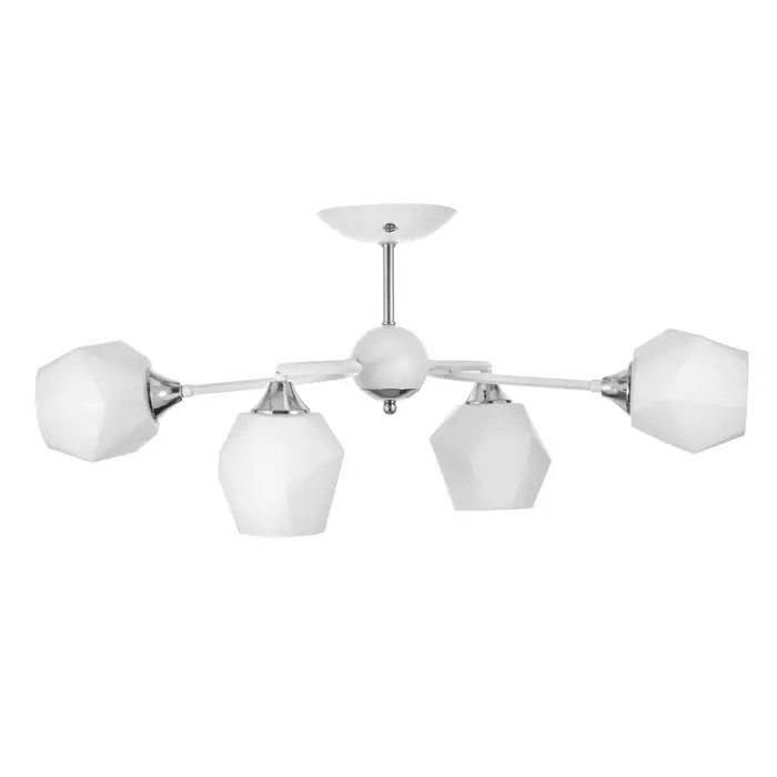 Свет, вытянутый в длину. Потолочный светильник с четырьмя многогранными плафонами — лаконичное решение для просторных интерьеров. Белый металл, гранёное стекло, вытянутая форма — всё это создаёт ощущение лёгкости и порядка в гостиной, на кухне или в спальне.