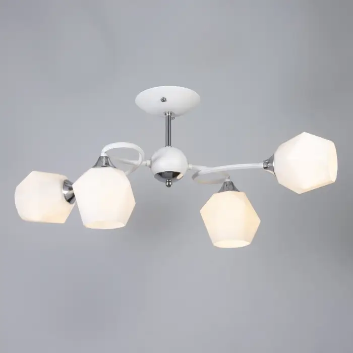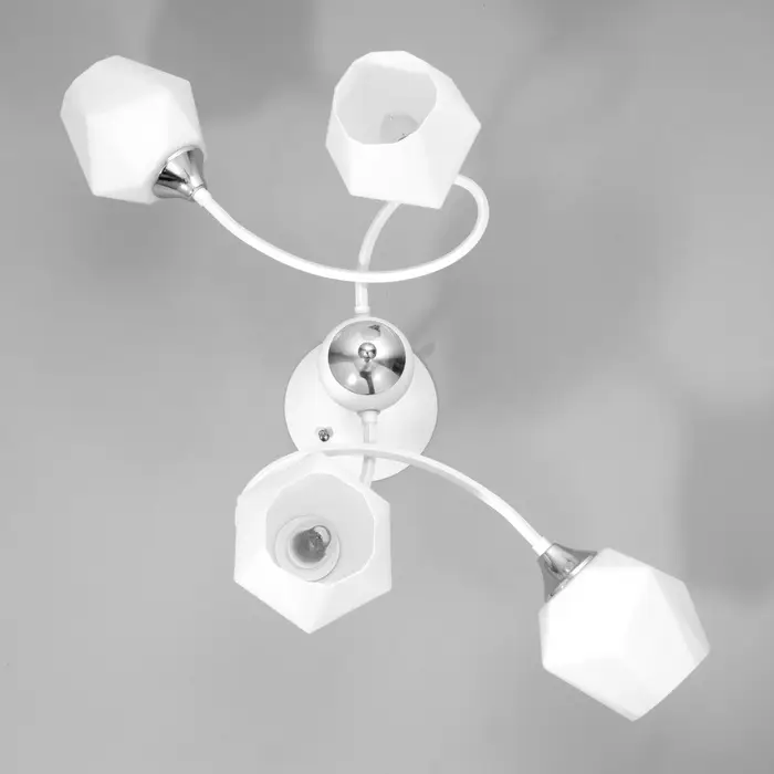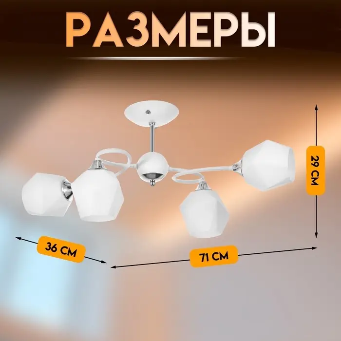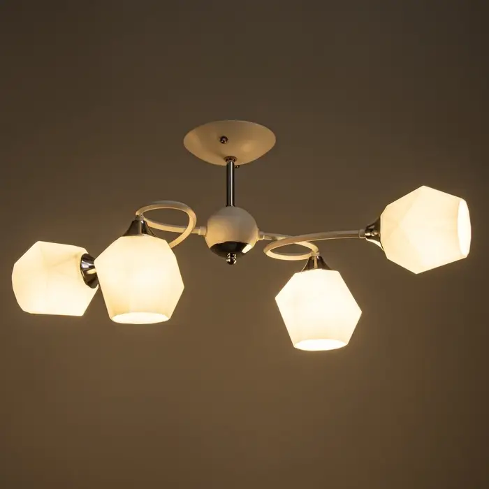 - Четыре стеклянных плафона с гранёной формой: Свет равномерно рассеивается, не создаёт резких теней. Белое матовое покрытие смягчает поток — комфортно для глаз даже при длительном пребывании в комнате.