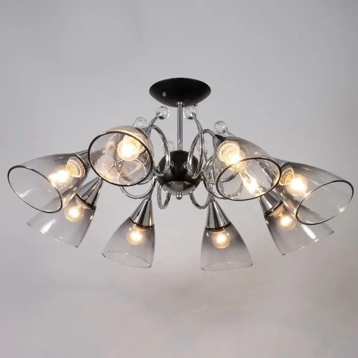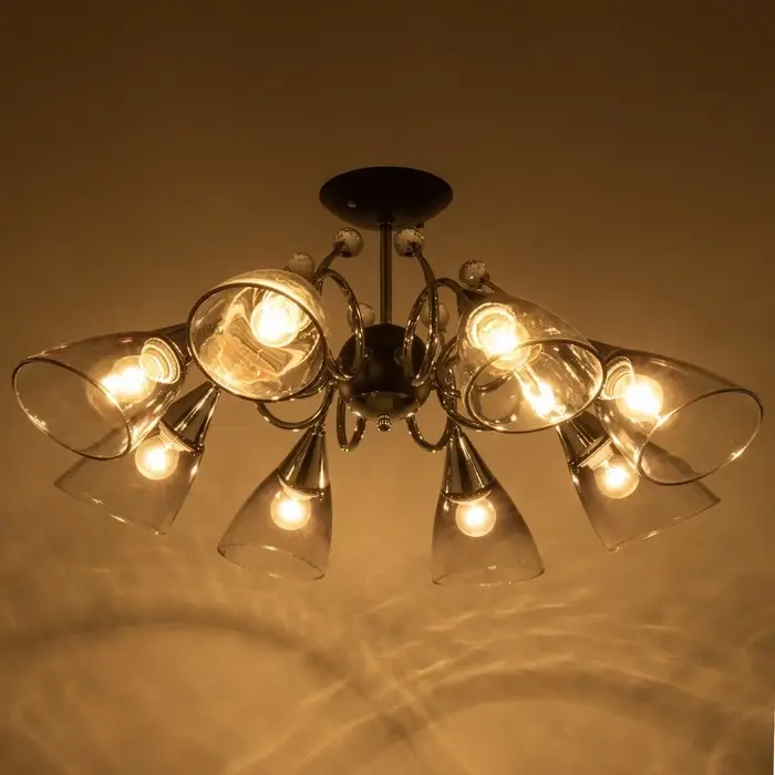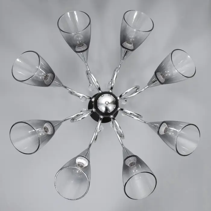 - Восемь тонированных стеклянных плафонов: Конусные рассеиватели создают равномерное рассеянное освещение без резких бликов. Цоколи E27 поддерживают лампы накаливания или светодиодные источники мощностью до 40 Вт каждый.