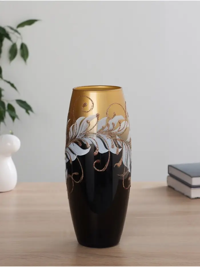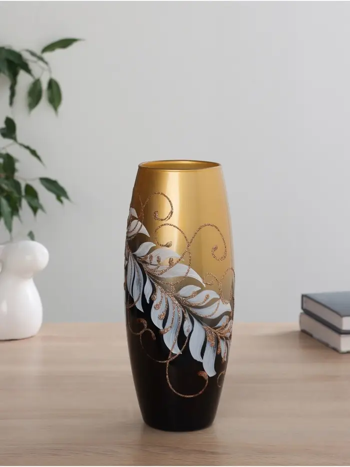 - Стильный дизайн: уникальная форма вазы в сочетании с золотистыми и черными оттенками будет великолепно смотреться в любом интерьере, от классического до современного.