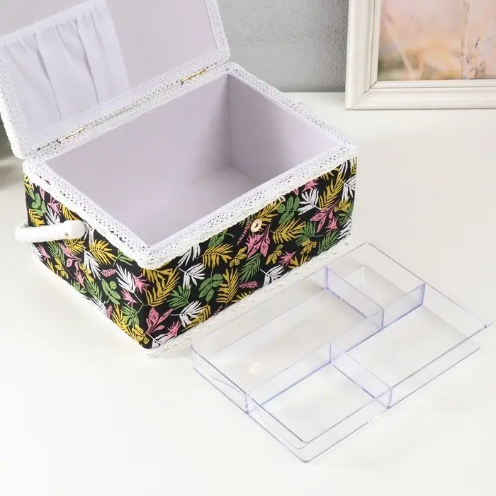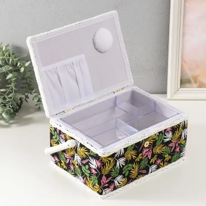 - Пять функциональных секций: Внутри вы найдете не просто ящик, а гибкую систему хранения. Перегородки помогают настроить пространство под разные мелочи — от катушек ниток до пуговиц и ножниц. Все лежит на своем месте и легко находится.