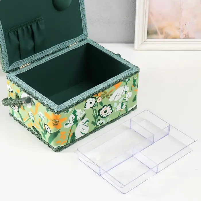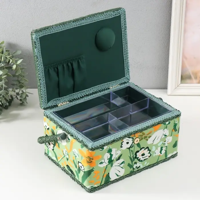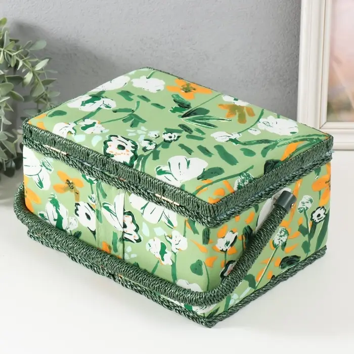 Практичная эстетика: Нежный рисунок с летними цветами на зеленом фоне создает приятную атмосферу для рукоделия. Шкатулка выглядит стильно и может оставаться на видном месте, становясь элементом декора вашей комнаты или мастерской. Это продуманный подарок для мастерицы на 8 Марта, День рождения или без всякого повода — чтобы творческий процесс приносил еще больше удовольствия.