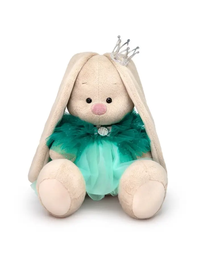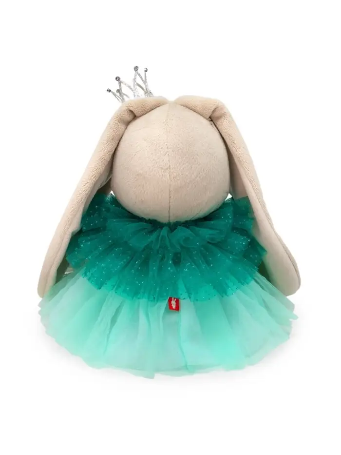 - На зайке платье из тонкой ткани с верхним слоем из нежной сеточки цвета бирюзовой воды, украшенное пышным воротником из нефритовой сеточки с блестящими вкраплениями и серебристым бантом с шикарной брошью со стразами. На голове серебряная корона с кристаллами.