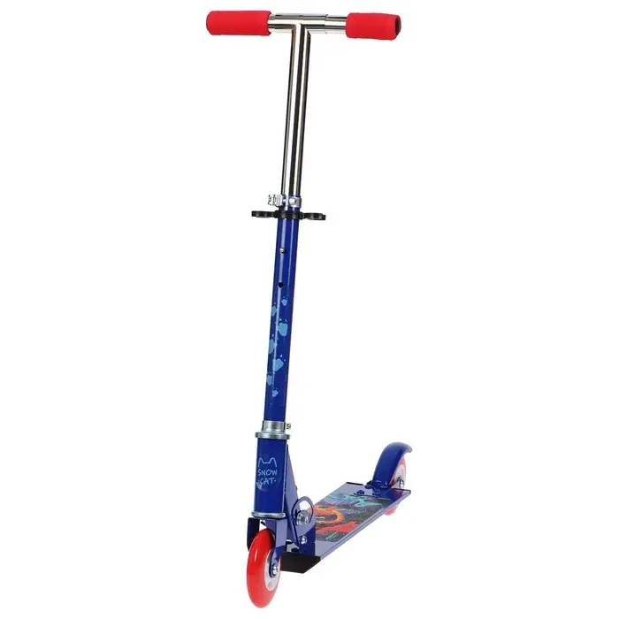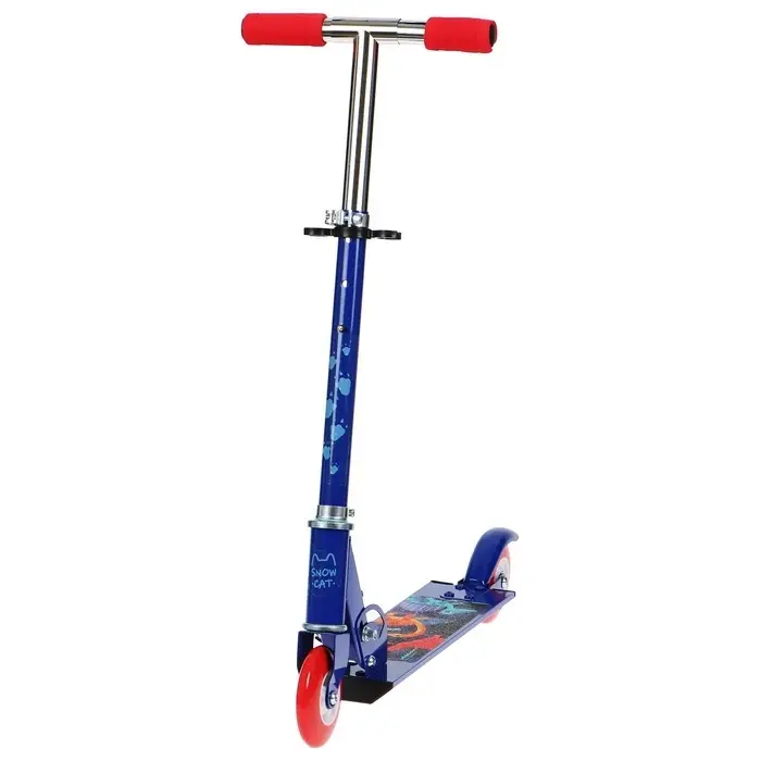 Платформа с шероховатым покрытием предотвращает скольжение ног. Высота руля регулируется и фиксируется в трёх положениях. Рама складывается: рулевая стойка опускается к деке. В таком положении самокат занимает мало места.