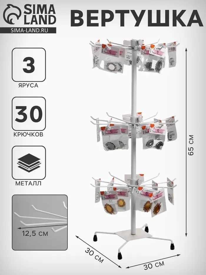 Вертушка QF, 3 яруса по 10 крючков, 30×30×65 см, белая