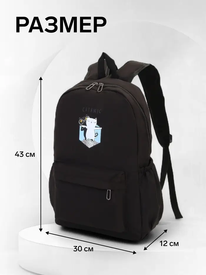 Рюкзак школьный на молнии, с карманами, с принтом, размер 30×12×43 см, чёрный