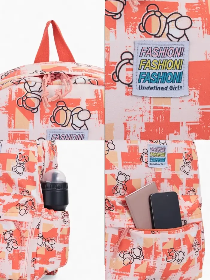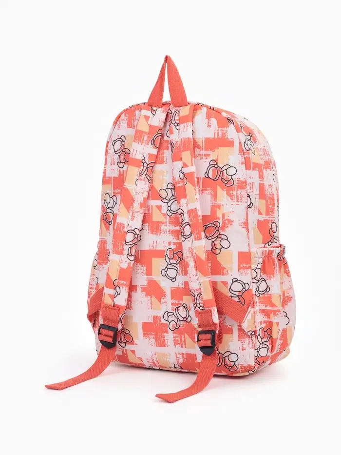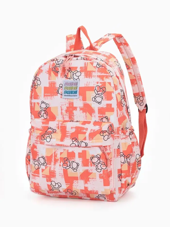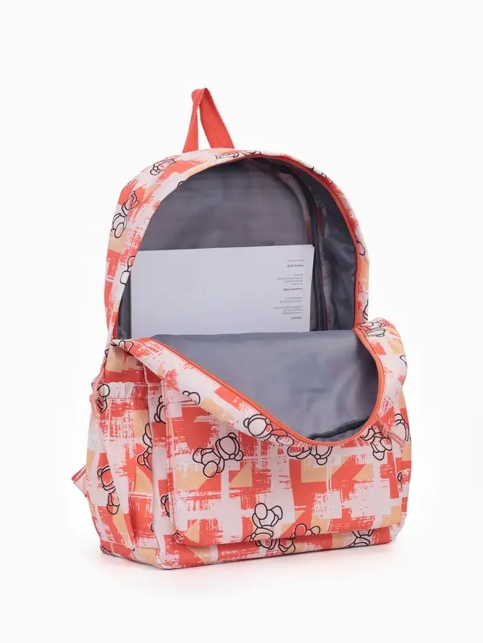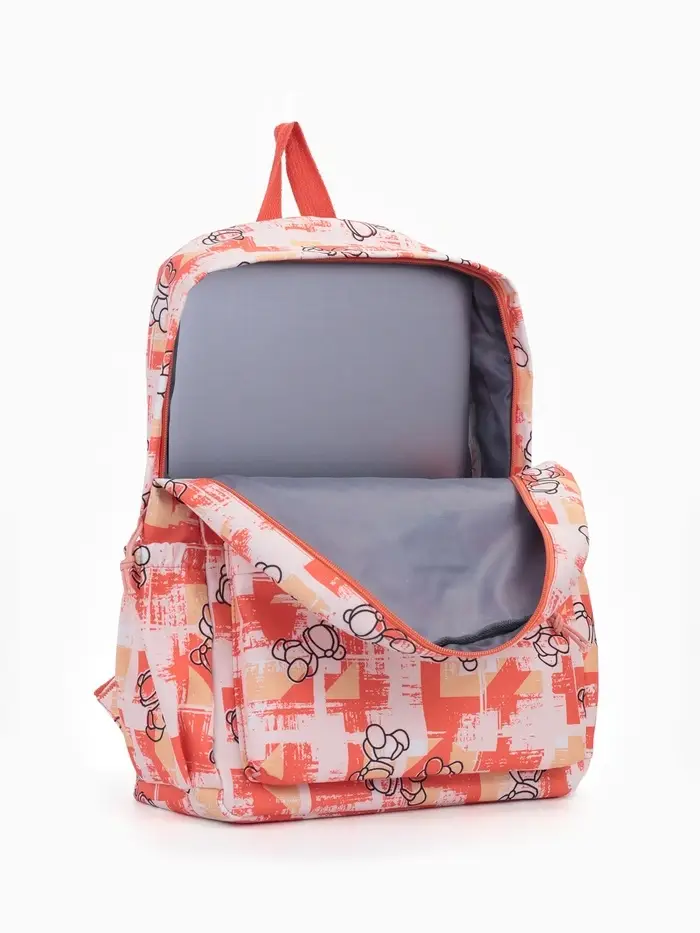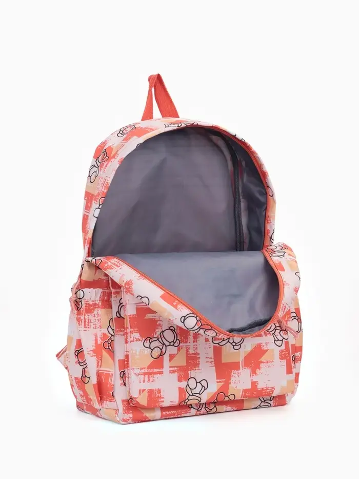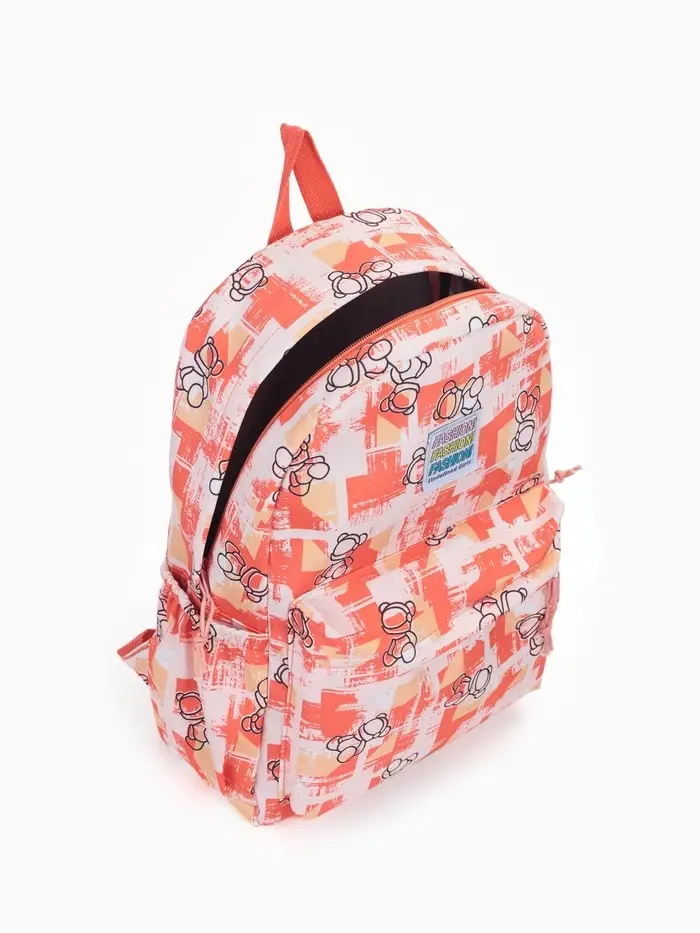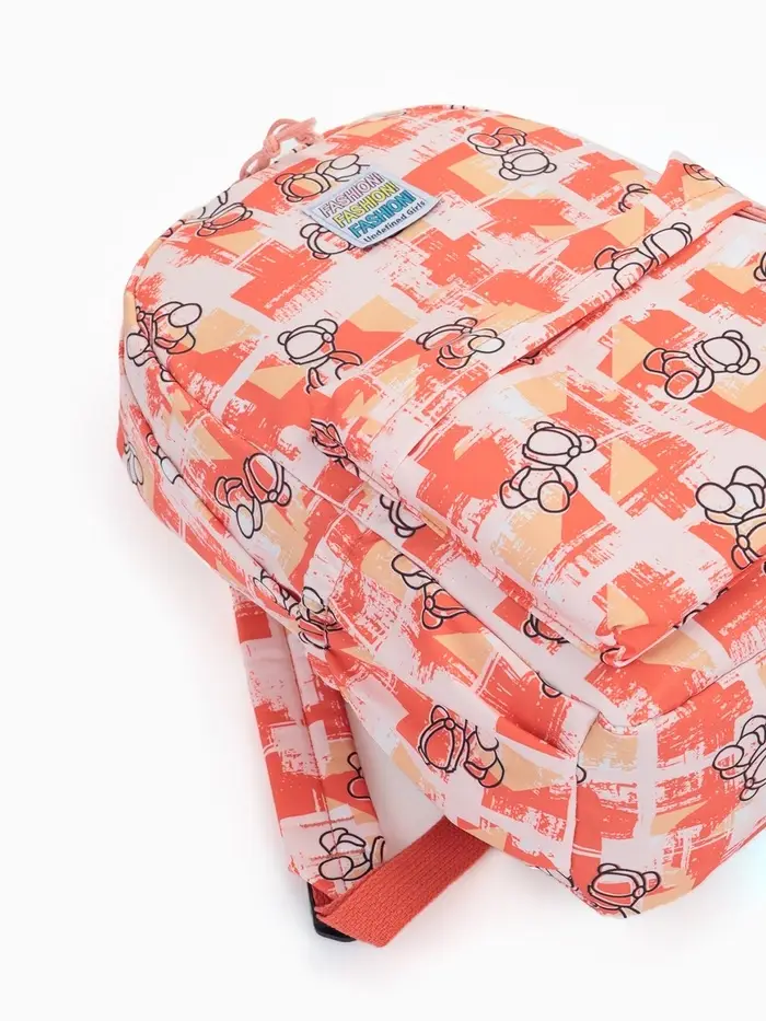 - Яркий оранжевый цвет и стильный принт с медведем делают рюкзак заметным и оригинальным.