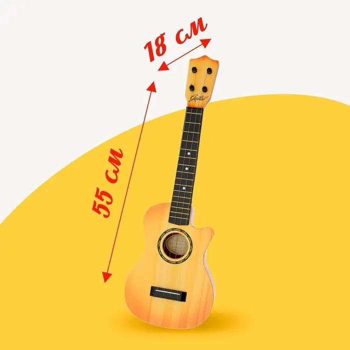 В комплекте есть удобный прозрачный чехол с ремнём, благодаря которому изделие легко носить с собой. У гитары 4 металлические струны, которые можно подкручивать колками.