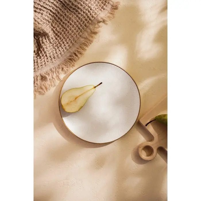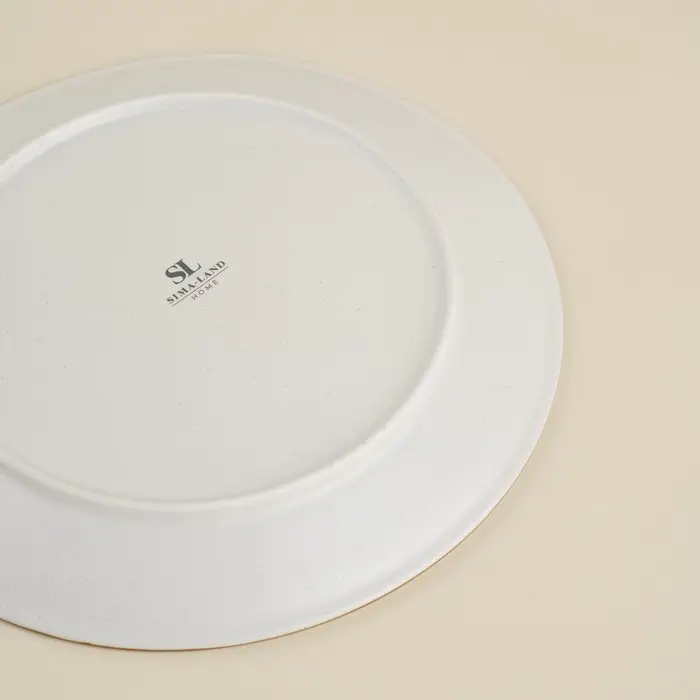 Тарелка выполнена из высококачественного фарфора, который обеспечивает долговечность и устойчивость к повреждениям. Белый цвет изделия гармонично сочетается с текстурой, имитирующей движение волн по камню, добавляя ощущение динамики и легкости.