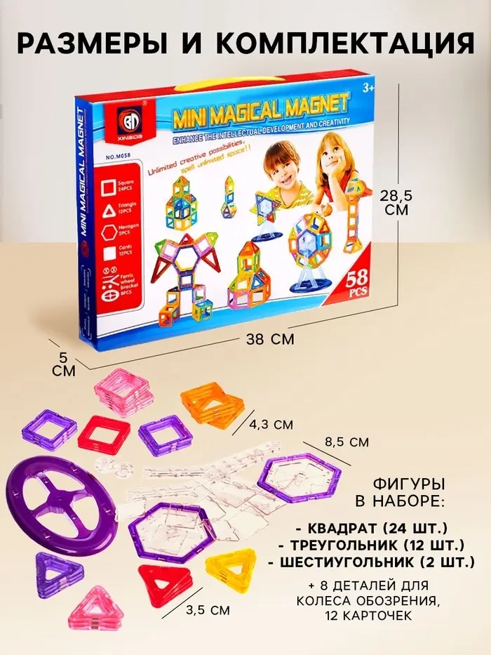 «Магический магнит»— это конструктор, детали которого соединяются как по волшебству. Под действием магнитного поля элементы притягиваются друг к другу, открывая неограниченный простор для экспериментов. Из ярких геометрических форм ребёнок соберёт машины, карусели, башни, вертолёты и даже ракеты. Иллюстрированная инструкция подскажет идеи новых моделей и продемонстрирует принципы конструирования, с ней создание фигурок станет проще и увлекательнее.