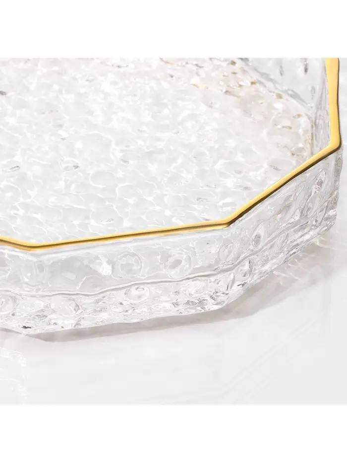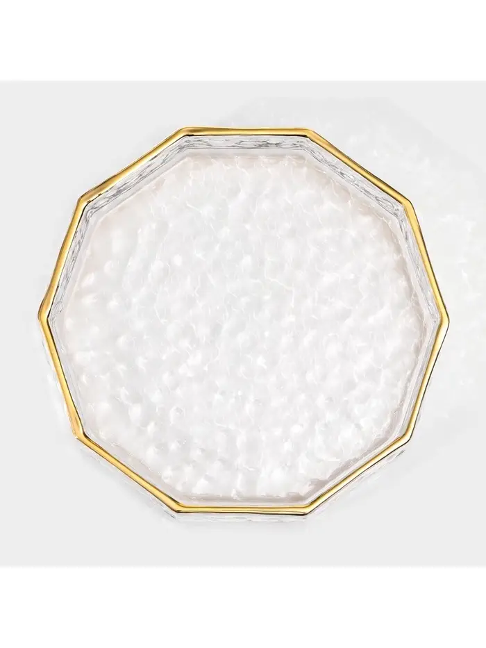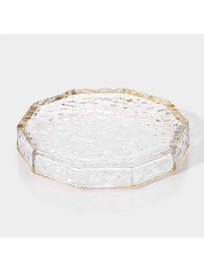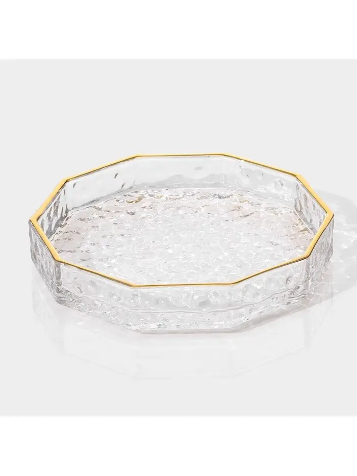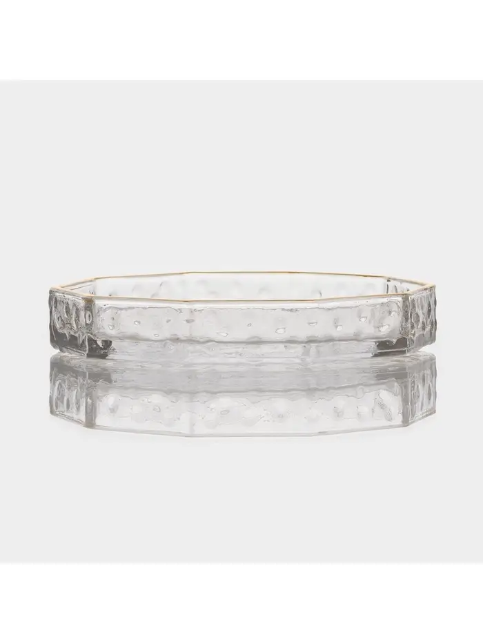 Украсьте подачу лаконичностью формы и светом деталей! Миниатюрный стеклянный поднос с золотой отводкой – изделие, сочетающее прозрачность и геометрию восьмиугольника, станет практичным и изящным акцентом на вашем столе.