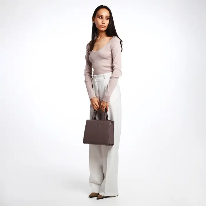 Эта коричневая сумка-тоут — ваш надёжный спутник для ежедневных дел. Её компактный, но жёсткий каркас сохраняет форму, а продуманная организация внутреннего пространства помогает быстро находить нужное. Сумка легко сочетается с повседневным гардеробом в любое время года.