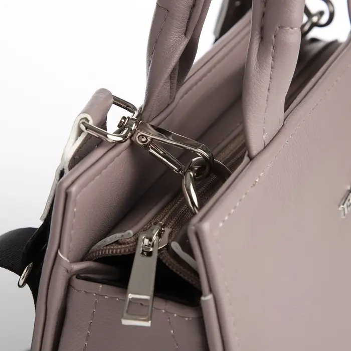 - Сдержанный дизайн в однотонном цвете «капучино» с серебристой фурнитурой подходит под большинство стилей.