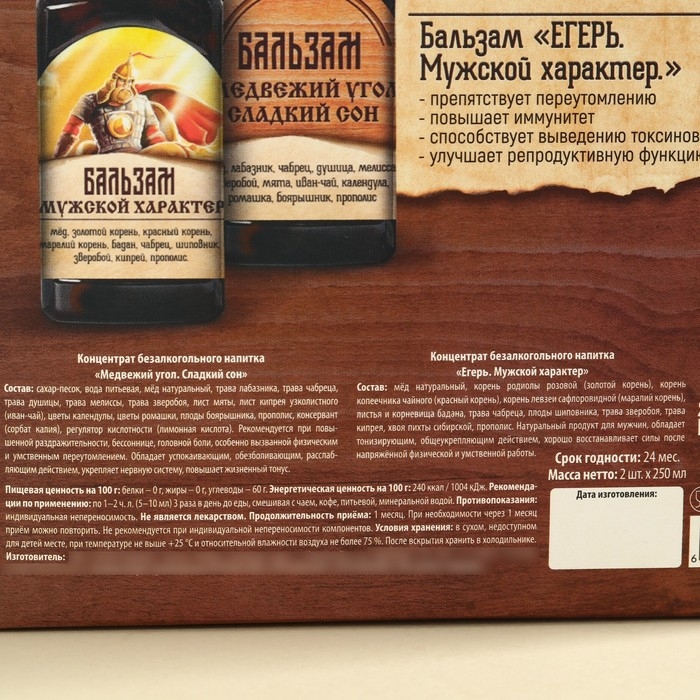 Состав: мёд натуральный, корень родиолы розовой (золотой корень), корень копеечника чайного (красный корень), корень левзеи сафлоровидной (маралий корень), листья и корневища бадана, трава чабреца, плоды шиповника, трава зверобоя, трава кипрея, хвоя пихты сибирской, прополис.