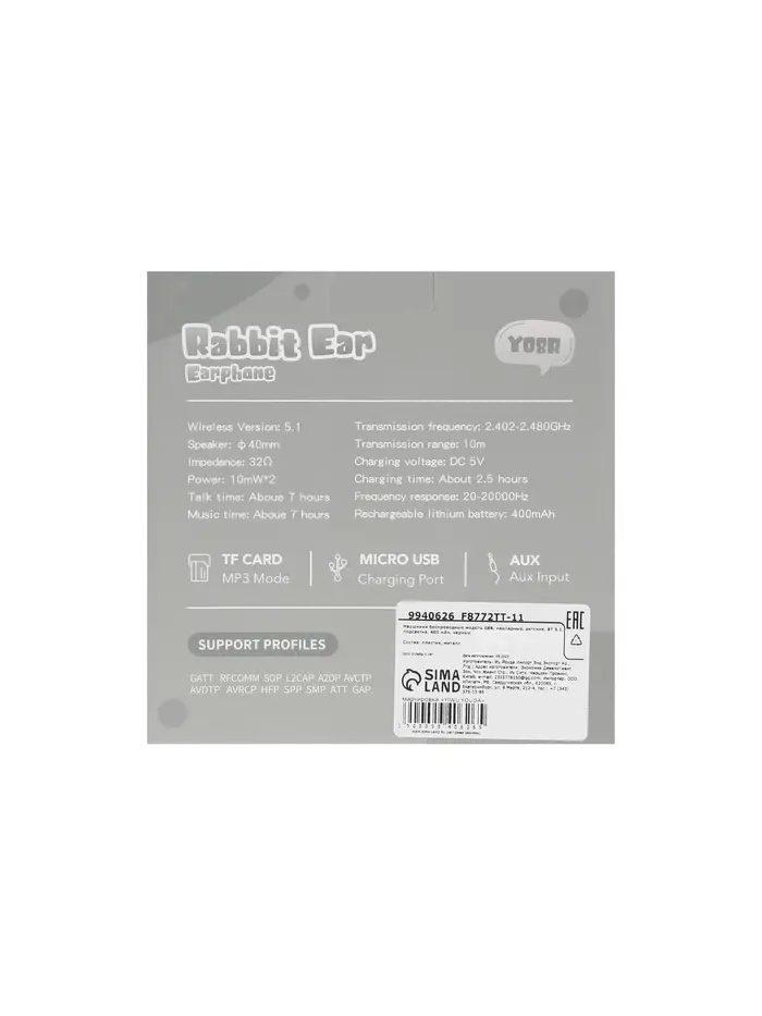 Наушники детские, беспроводные, накладные, с ушками зайца, Y08R, Bluetooth 5.1, с микрофоном, с подсветкой, 400 мАч, белые