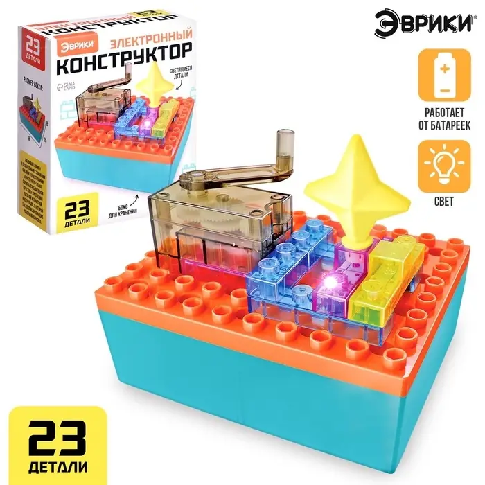 Электронный конструктор «Эврики» поможет ребёнку развить логику и познакомит его с законами физики и электроники. Конструктор легко собирается благодаря простому креплению деталей и подробной инструкции, в которой описан принцип действия механизма.
