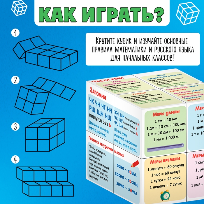 Развивающий трансформер для детей от 3 лет станет отличным помощником в обучении русского языка и математики. Куб состоит из восьми частей, которые можно крутить, собирая различные комбинации.