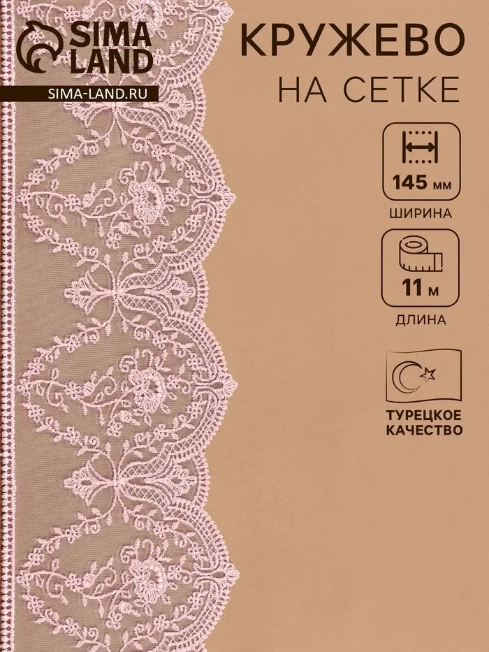Кружево на сетке, 145 мм, 11±1 м, нежно-розовое