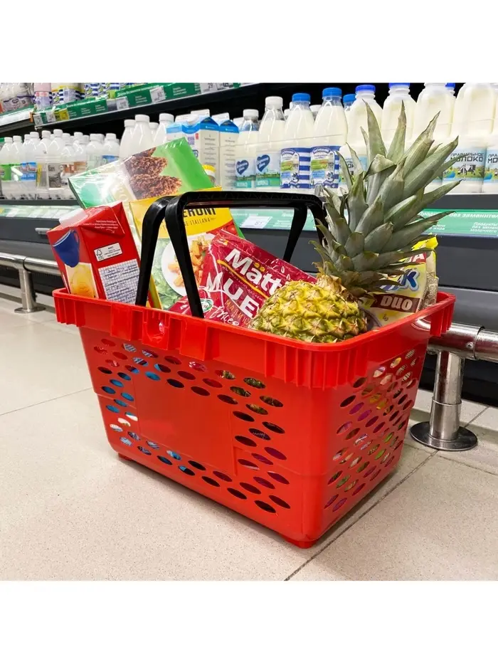 - Вместимость 20 литров: Объема достаточно для крупной продуктовой закупки на несколько дней. В корзину помещаются бутылки, упаковки, овощи и фрукты — всё, что нужно для семьи.