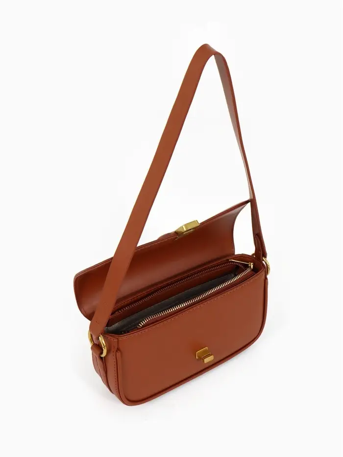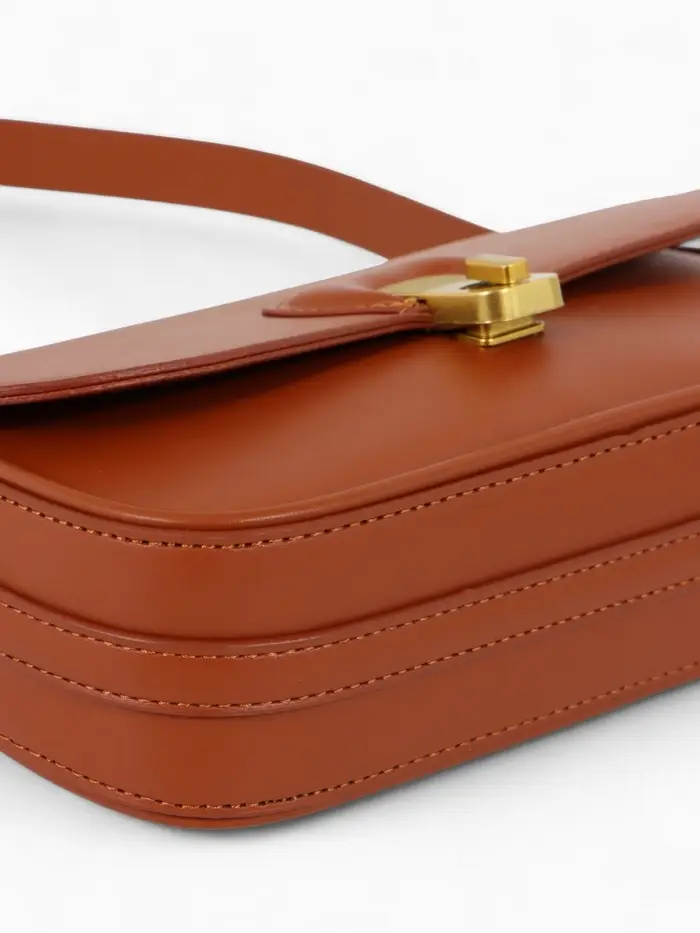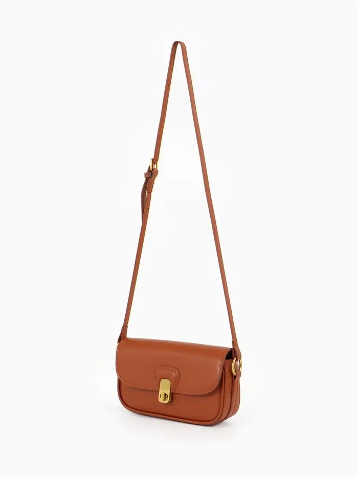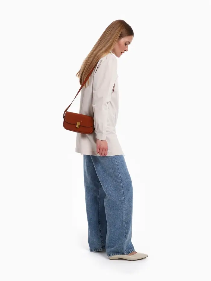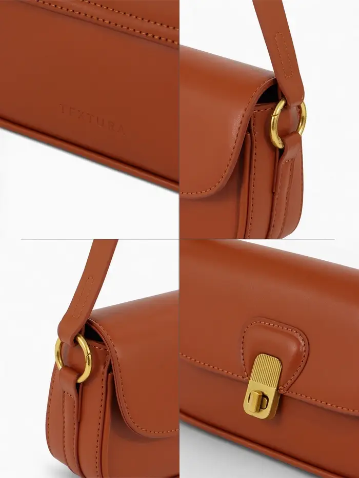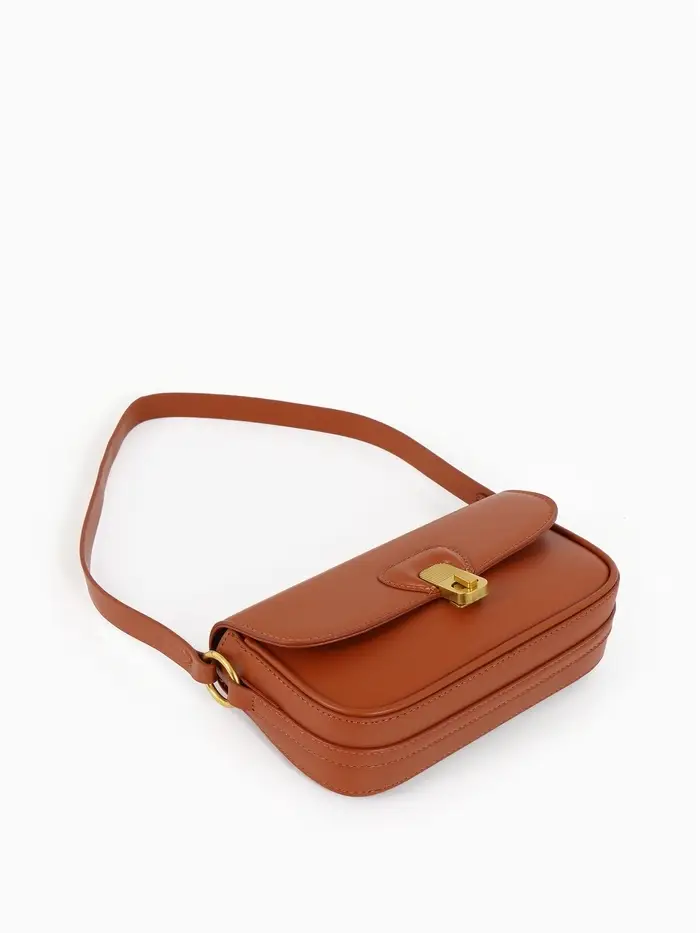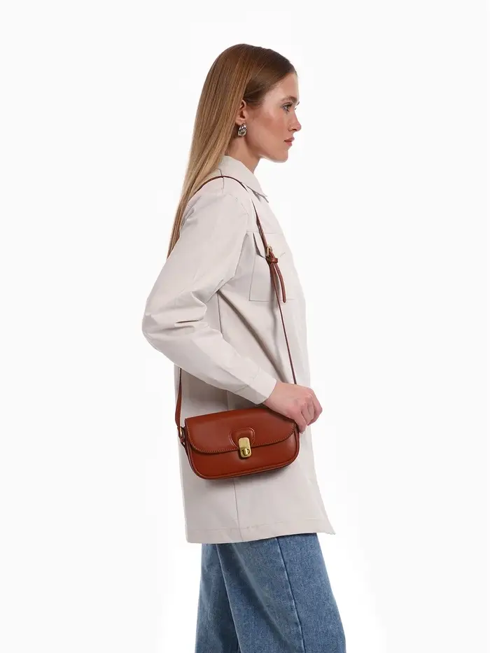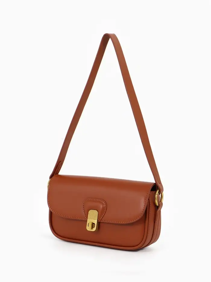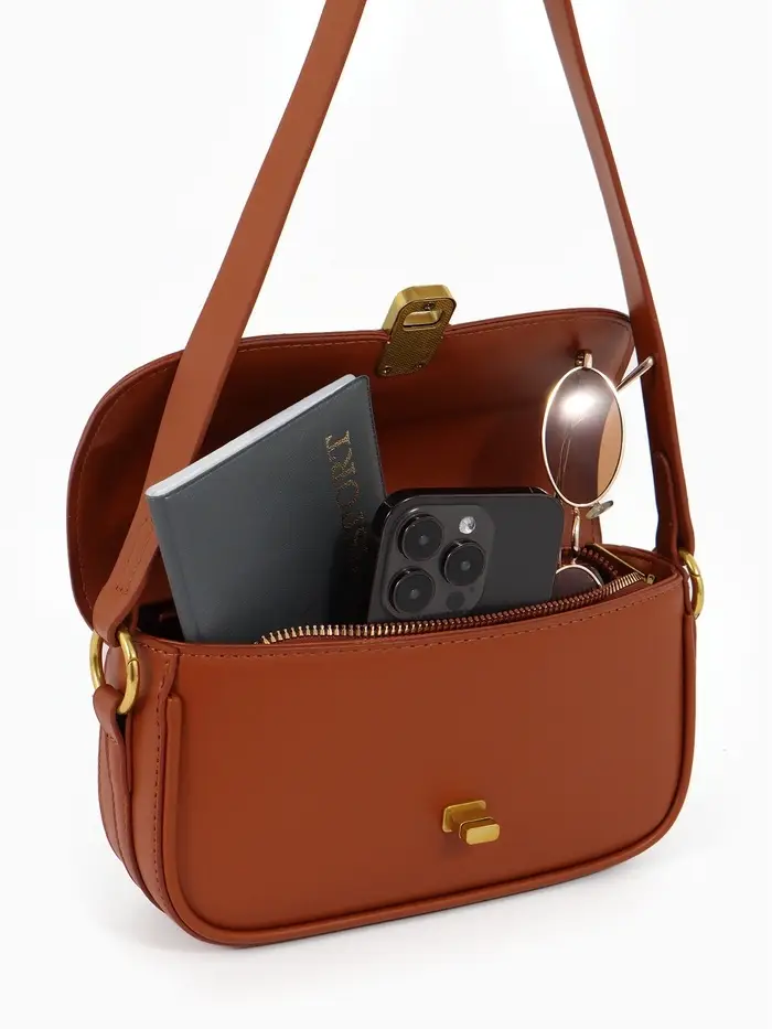 Эта коричневая сумка-багет — ваш идеальный повседневный спутник. Её компактный, но жёсткий каркас сохраняет безупречную форму, а лаконичный дизайн с золотой фурнитурой добавляет образу изюминку. Сумка легко сочетается с разными стилями, оставаясь функциональной в любое время года.