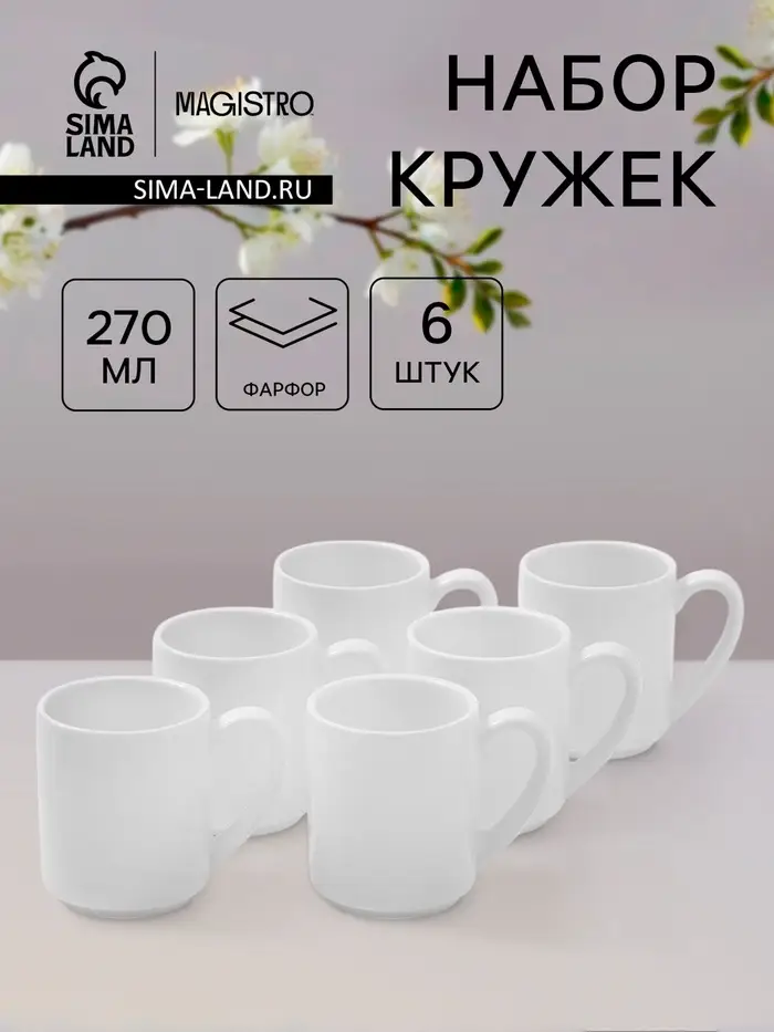 Набор кружек Magistro Mien, 270 мл, 6 шт., фарфор, белый