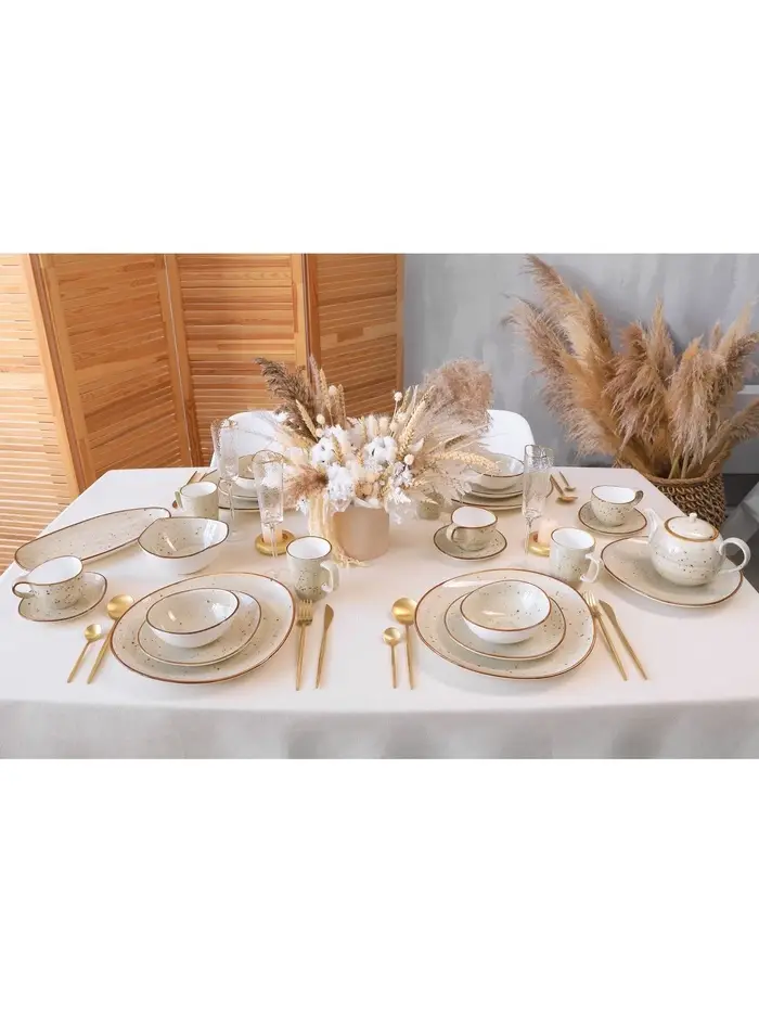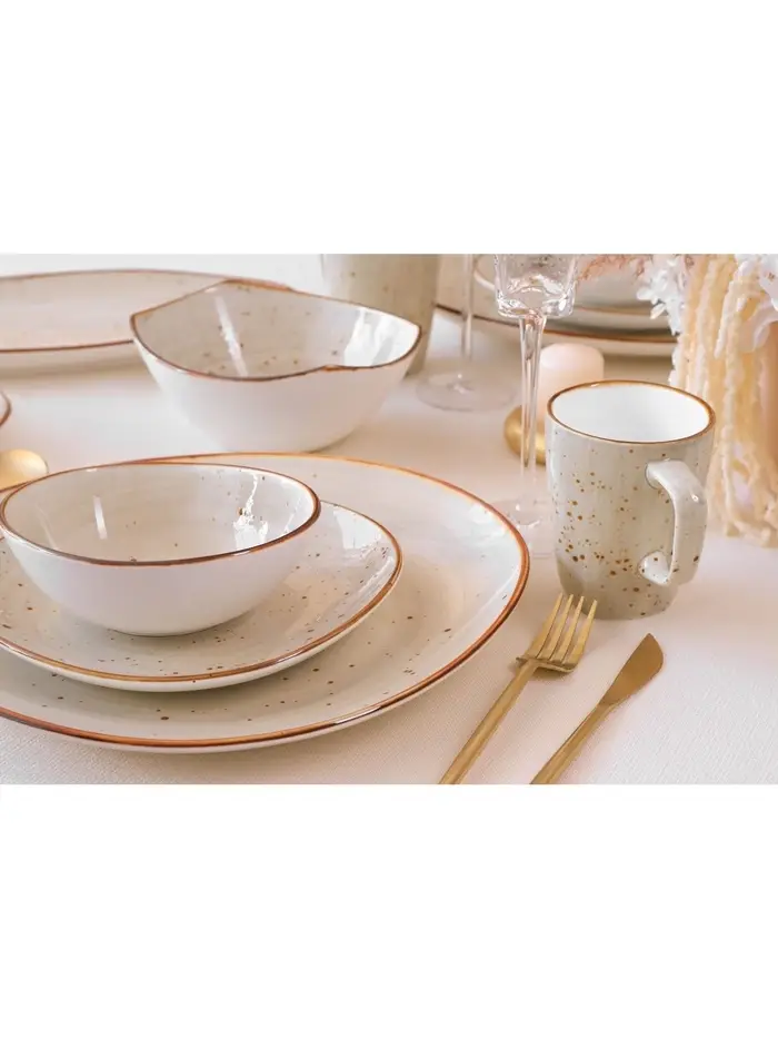 Фарфор этой коллекции отличается неповторимым цветом: нежный бежевый в крапинку. Такое цветовое решение делает каждую тарелку, кружку, блюдце или салатник настоящим произведением искусства.