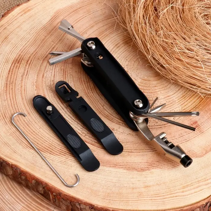 Инструмент изготовлен из прочной углеродистой стали с гальваническим покрытием, что обеспечивает устойчивость к износу и коррозии. Мультитул объединяет в себе 12 функций, позволяя выполнять основные виды обслуживания велосипеда без необходимости носить с собой отдельные инструменты.