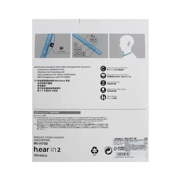 Наушники спортивные беспроводные, WI-H700, вакуумные, Bluetooth 4.2, с микрофоном, 100 мАч, синие