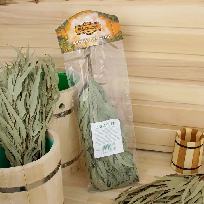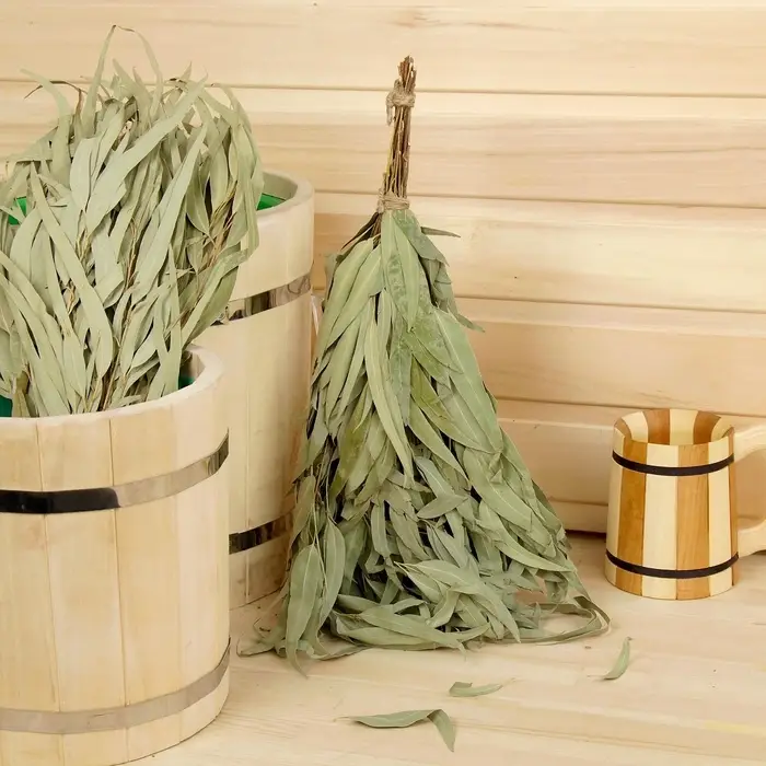 С веником из эвкалипта банные процедуры эффективны вдвойне. Его листья полны эфирными маслами, которые обладают противовоспалительными и антисептическими свойствами. Зачастую применяется для ингаляций и как средство питающее слизистую оболочку. Легкие пары оказывают быстрое воздействие на организм.