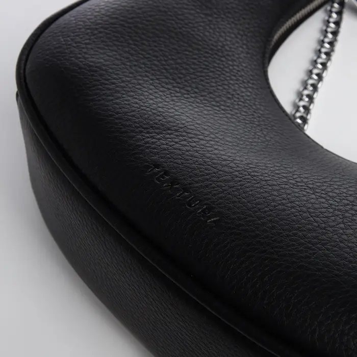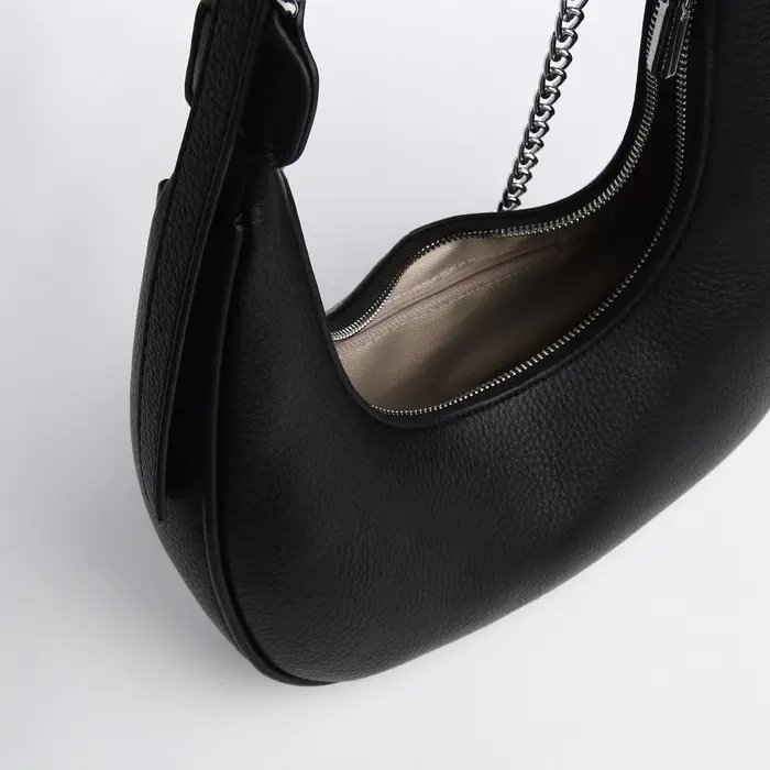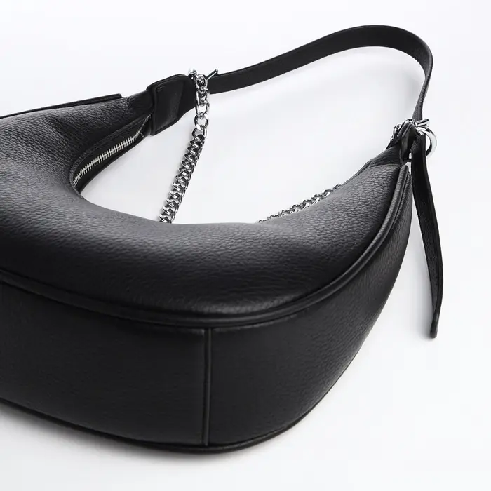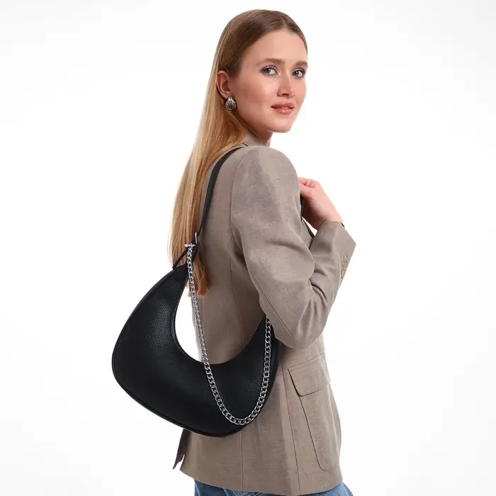 Эта чёрная сумка-багет — ваш идеальный спутник на каждый день. Её лаконичный полукаркасный силуэт в форме полумесяца сохраняет форму, оставаясь мягкой и удобной. Универсальный средний размер легко вмещает всё необходимое, не перегружая образ.