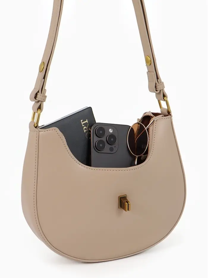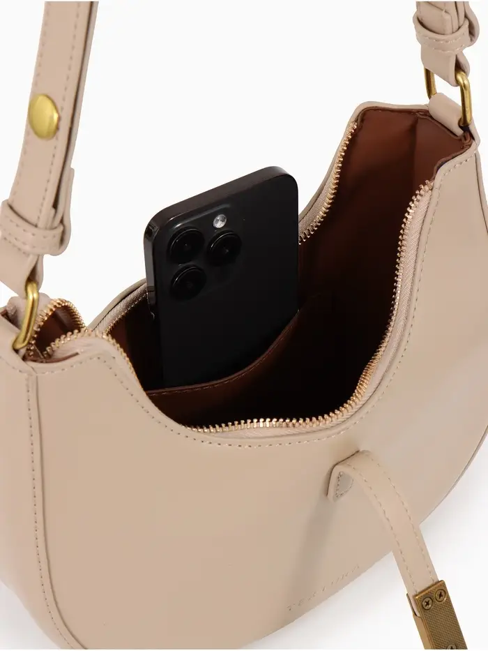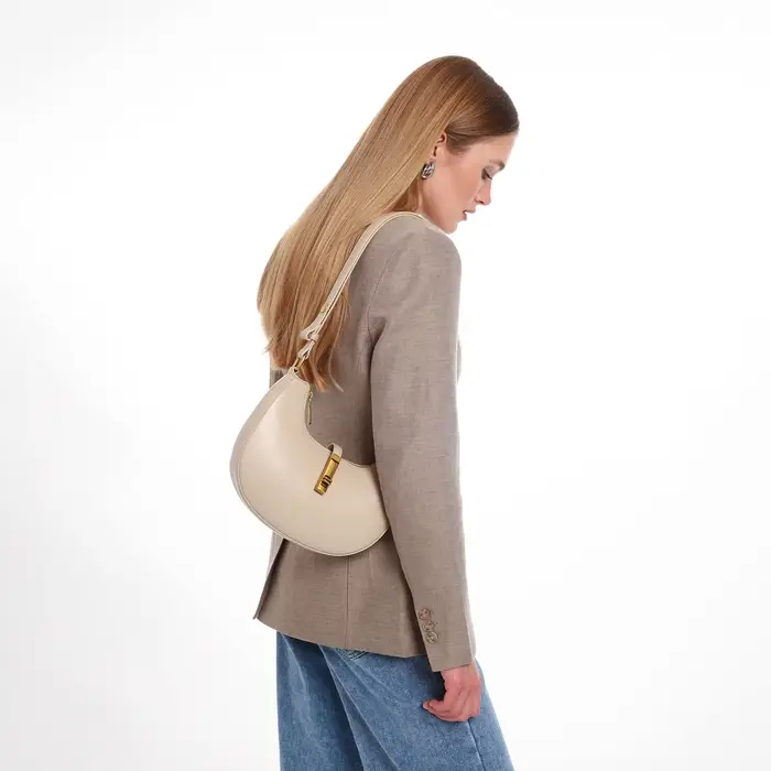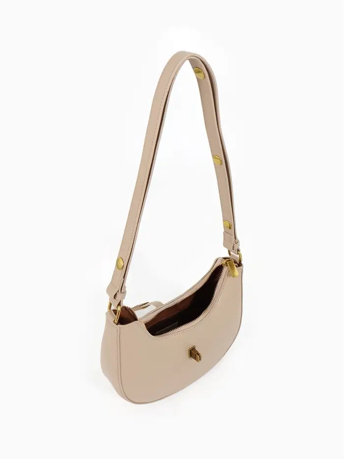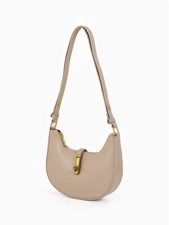 Эта бежевая сумка-багет — ваш идеальный спутник на каждый день. Её жёсткая структурированная форма сохраняет безупречный вид, а компактные размеры легко вмещают всё необходимое. Классический дизайн с золотой фурнитурой добавляет образу элегантности, оставаясь при этом универсальным.
