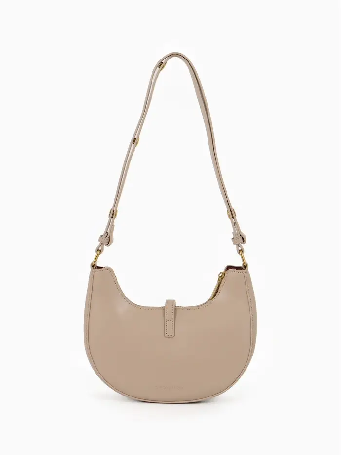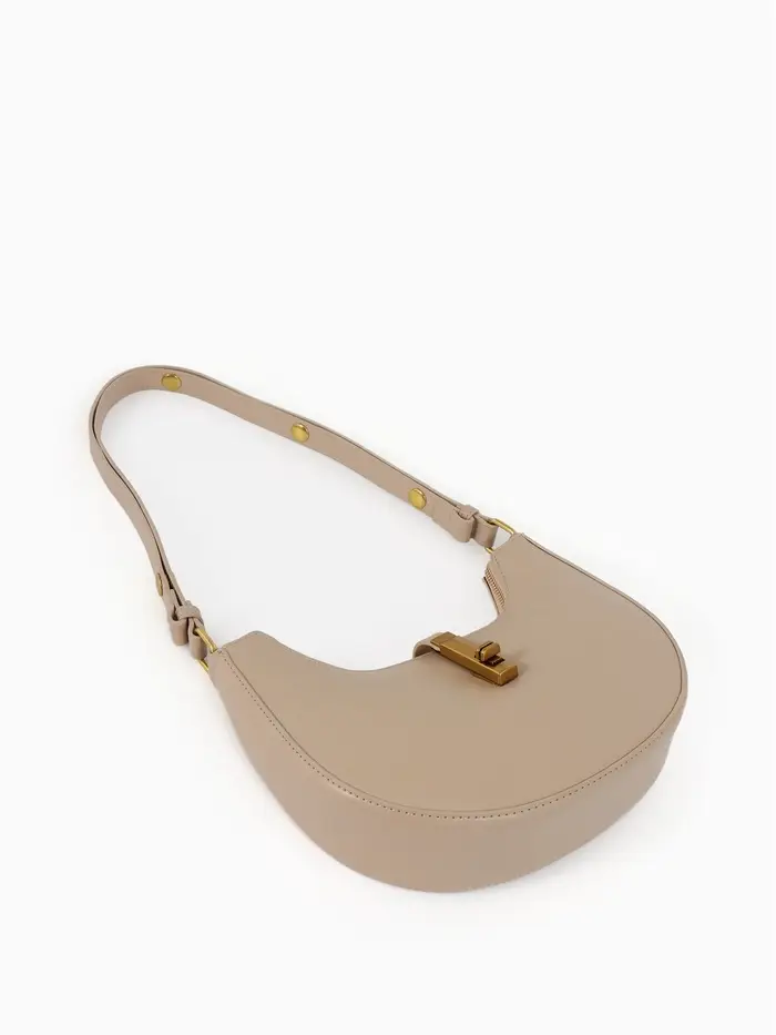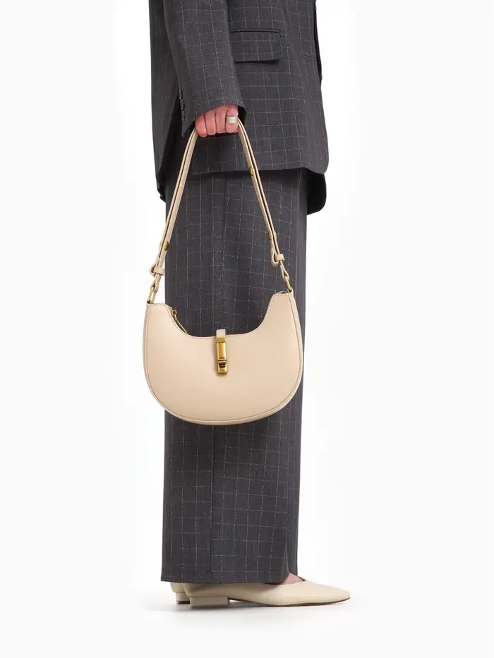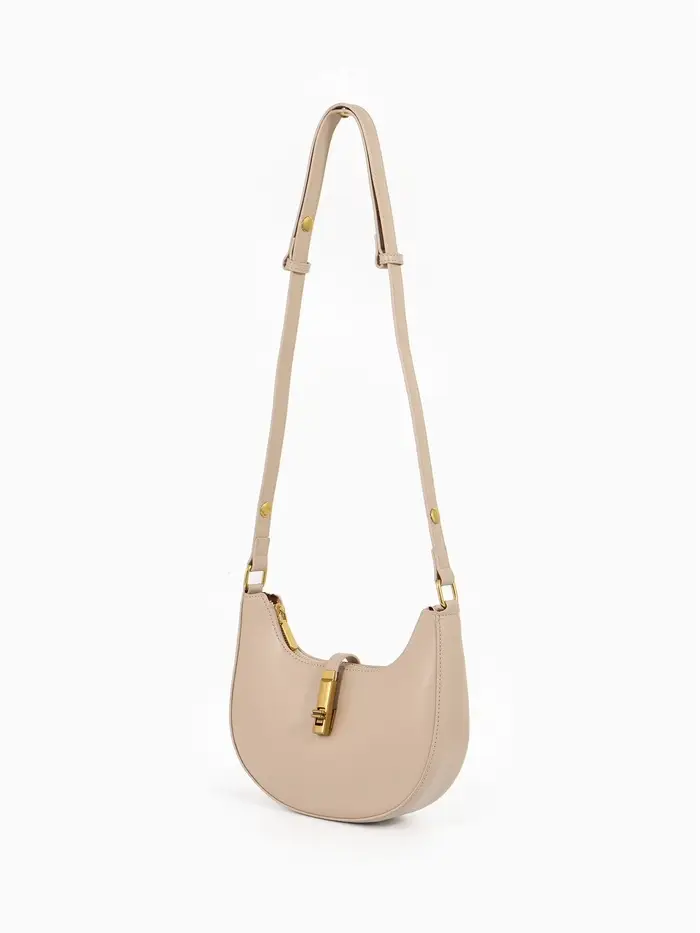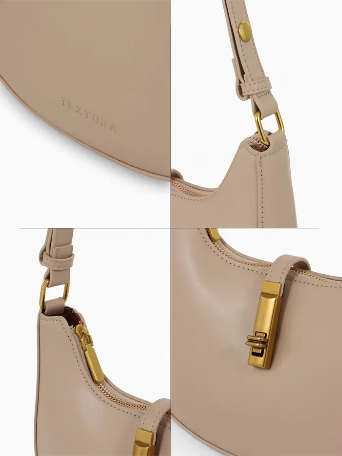 Эта бежевая сумка-багет — ваш идеальный спутник на каждый день. Её жёсткая структурированная форма сохраняет безупречный вид, а компактные размеры легко вмещают всё необходимое. Классический дизайн с золотой фурнитурой добавляет образу элегантности, оставаясь при этом универсальным.