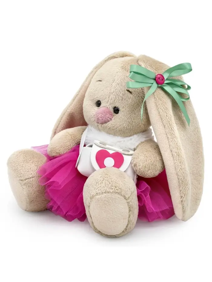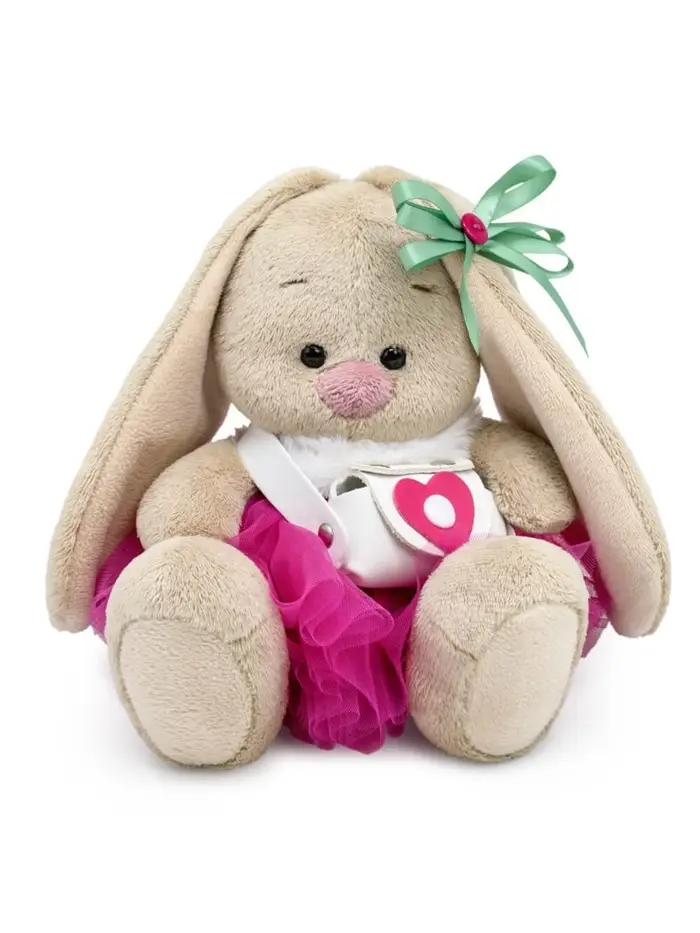 - На зайке пышная юбочка‑пачка из нескольких слоев воздушной сеточки цвета малинового мармелада, белоснежный меховой воротничок на пуговке и стильная белая сумочка из эко‑кожи, украшенная розовым сердечком. На ушке милый бант из атласной ленты цвета полыни с малиновой пуговкой в середине.