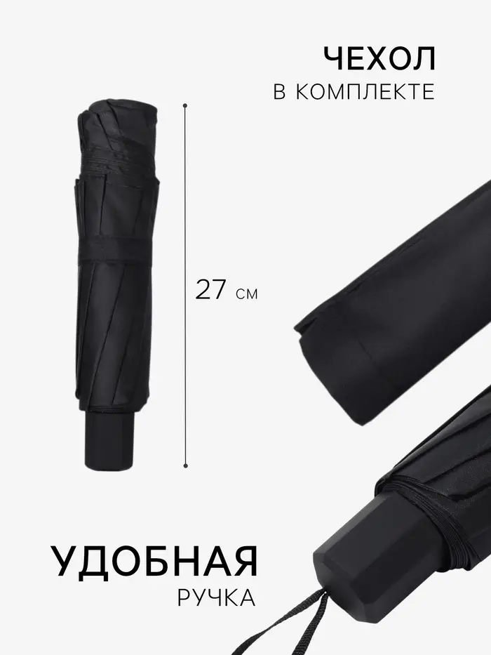 Зонт механический «Однотон», эпонж, 4 сложения, 10 спиц, R=53/62 см, d=106 см, чёрный