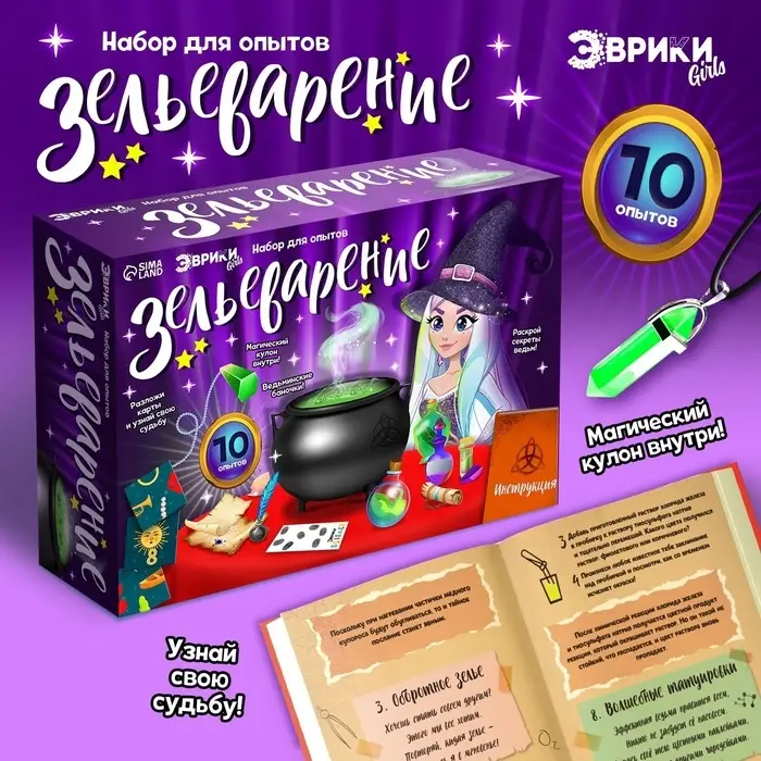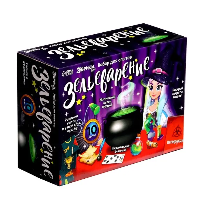 С набором «Зельеварение» у ребёнка получится провести 10 волшебных опытов! Например, зажечь зелёное пламя, написать послание невидимыми чернилами и много другое. Всё необходимое для этого есть в комплекте.