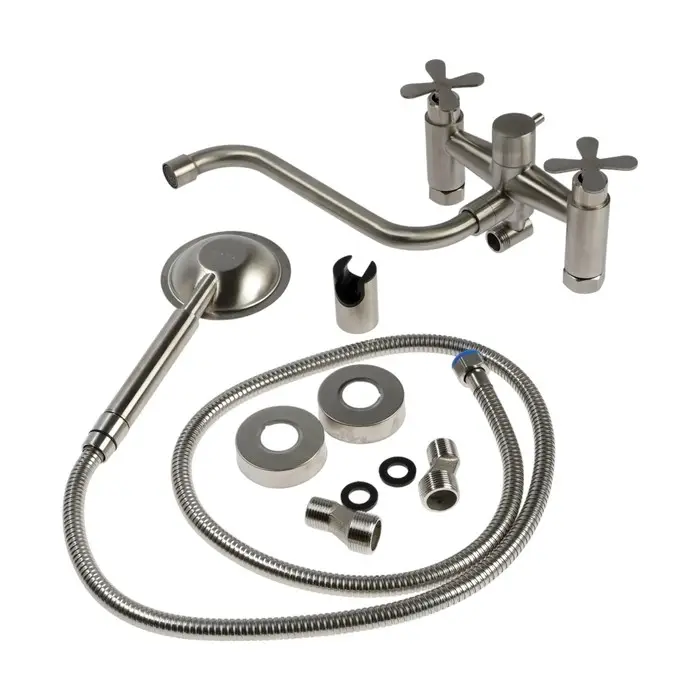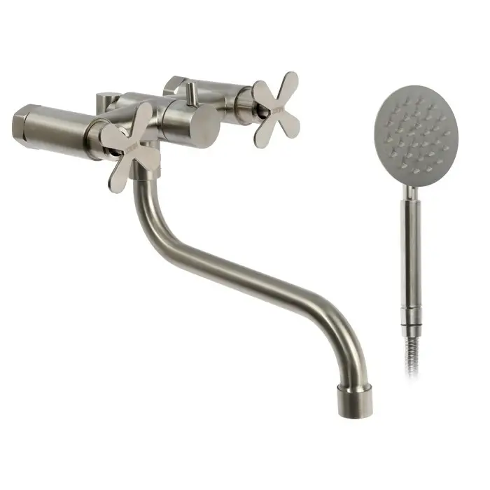 Смеситель для ванны ZEIN Z3733, двухвентильный, S-образный излив 21 см, лейка, шланг, сатин