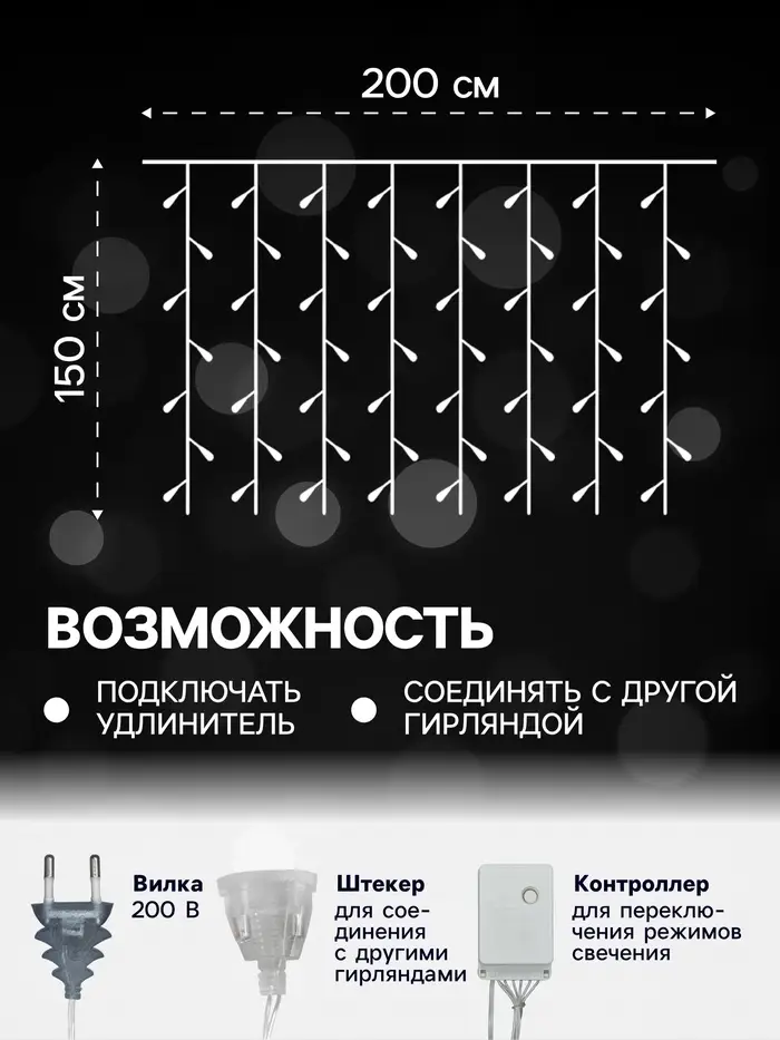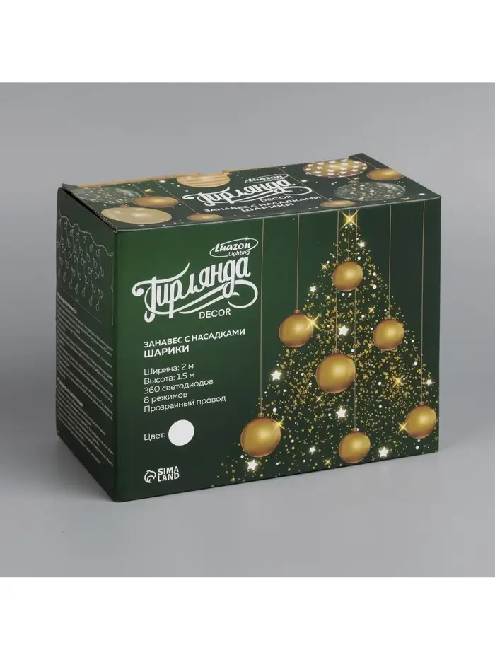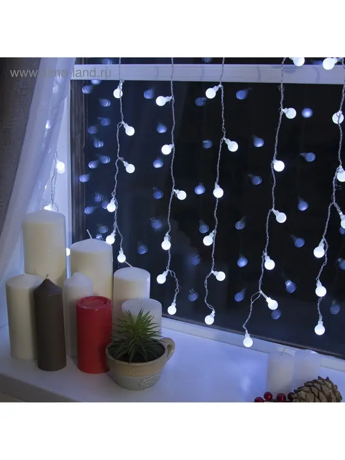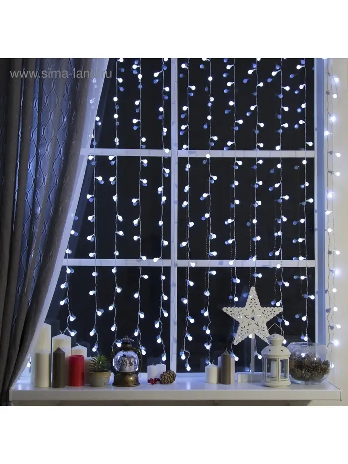 Гирлянда «Занавес» 2×1.5 м с насадками «Шарики», IP20, прозрачная нить, 360 LED, свечение белое, 8 режимов, 220 В