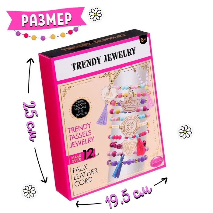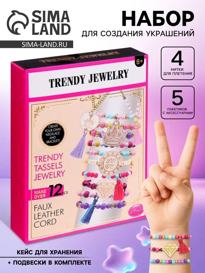 В наборе есть всё необходимое для творчества: аксессуары для плетения, из которых можно делать украшения в разных стилях.