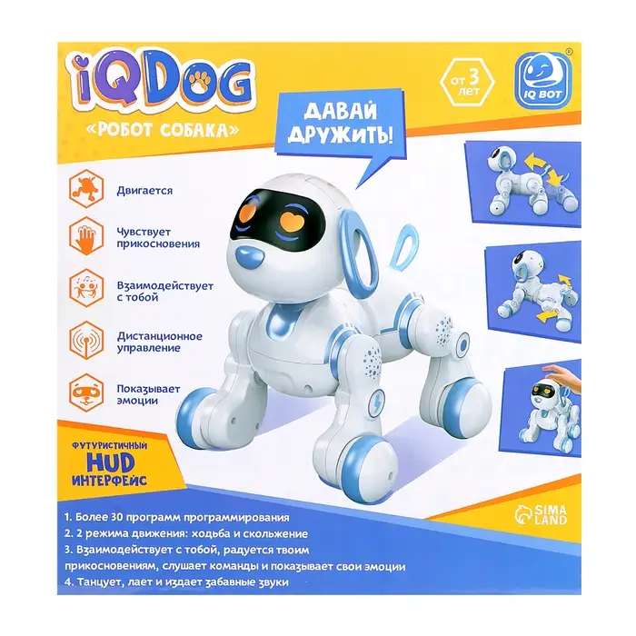 Робот-собака IQDog — интерактивная игрушка, которая станет верным другом для малыша. Вместе с ребёнком собака готова играть, выполнять команды и даже петь песни! Совсем как настоящий щенок, она требует внимания и реагирует на поглаживания.