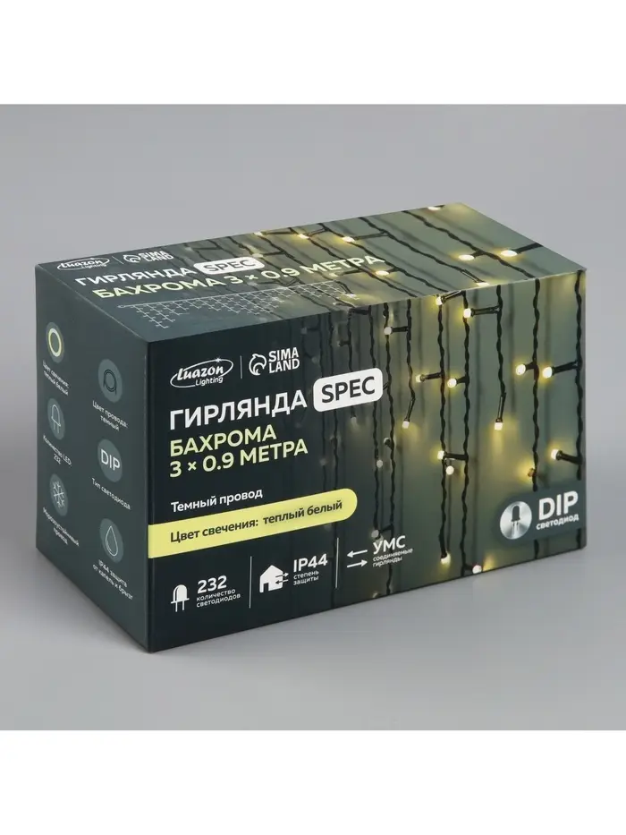 Гирлянда «Бахрома» 3×0.9 м, IP44, УМС, тёмная нить, 232 LED, свечение тёплое белое, 220 В